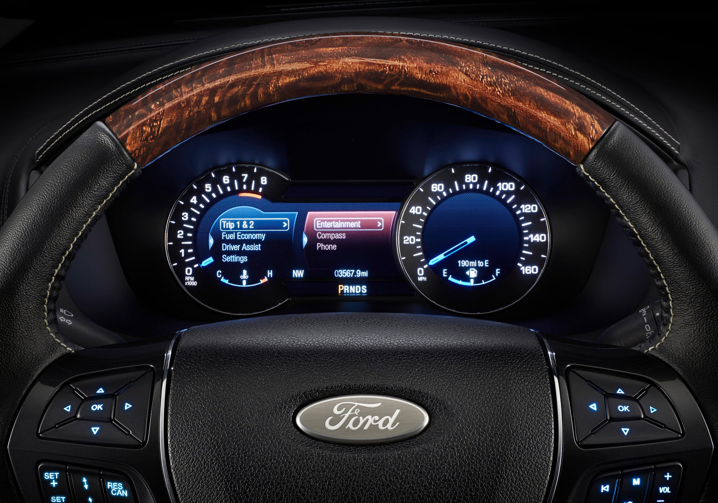 And Ford’s first use of a 10-in instrument cluster display flanked by analog gauges greets drivers when the slip behind the wheel.