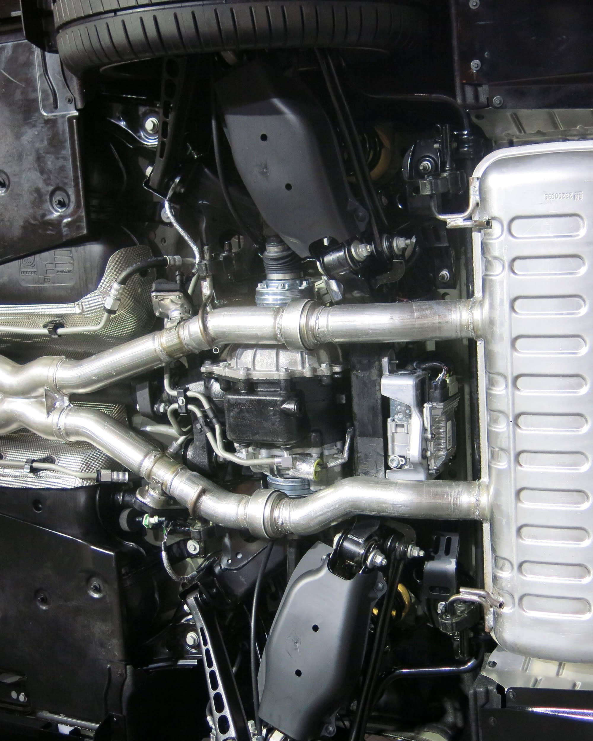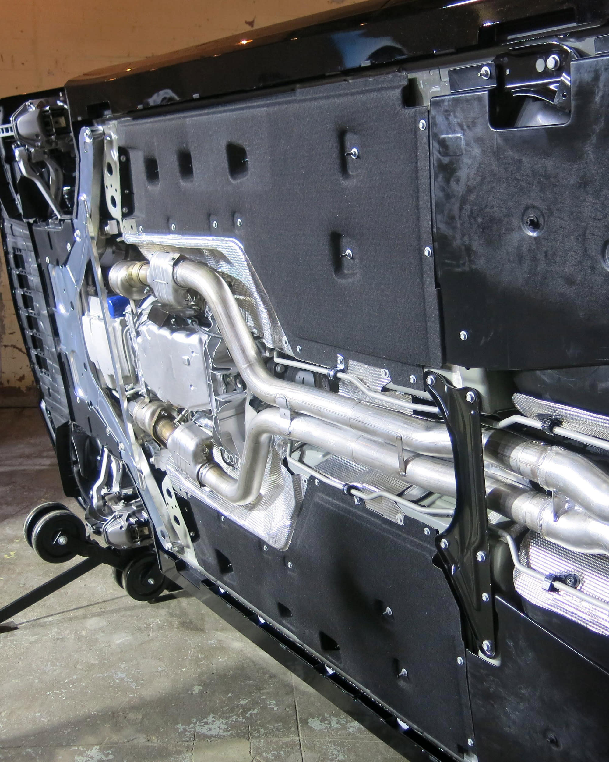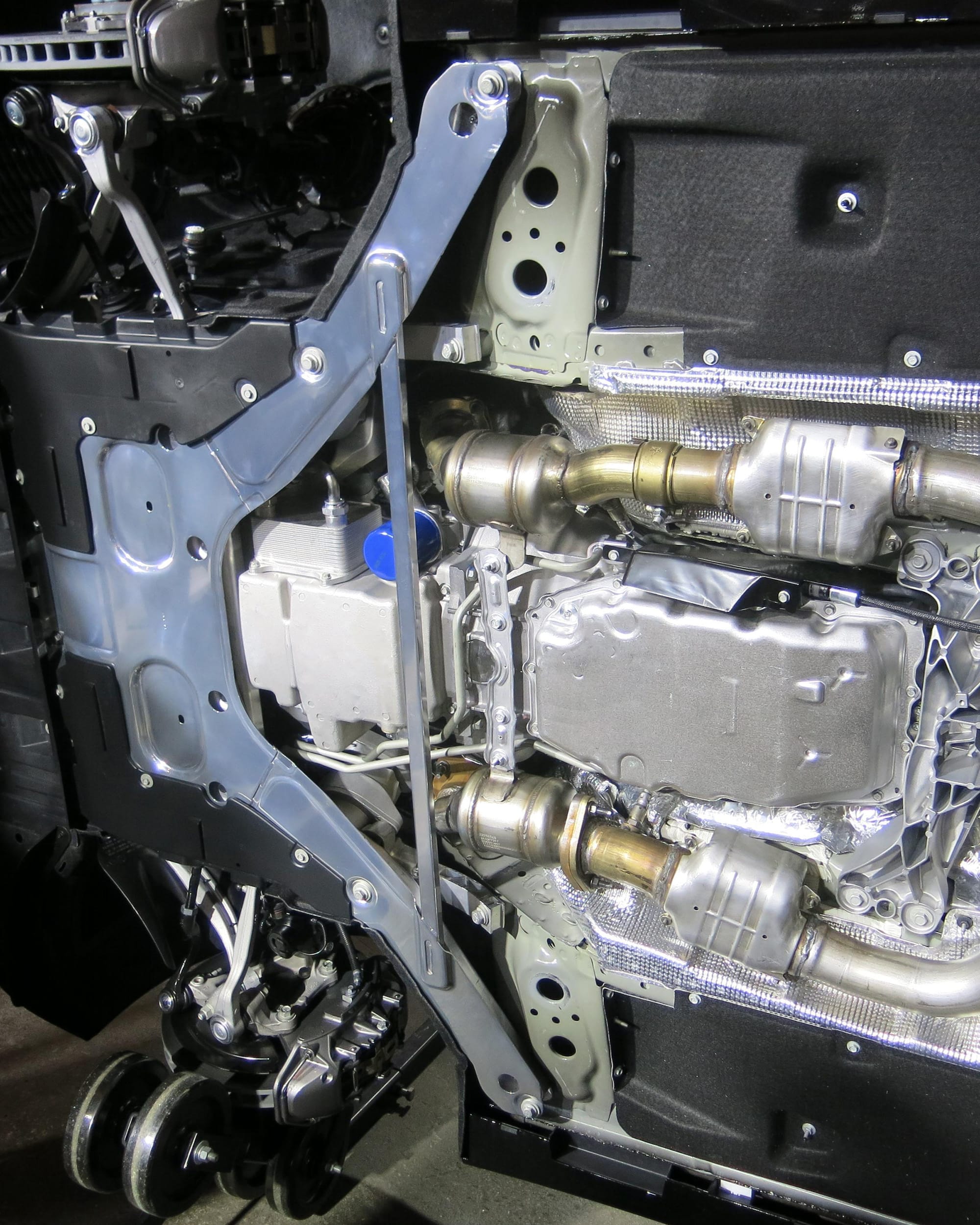 For the 114.6-in (2910-mm) wheelbase sedan, “tire size and performance drove development of our stiffer structure—up about 25% over the previous car,” Roma said. Actions related to improving overall body rigidity included a large aluminum shear panel underneath the front of the chassis. The relatively massive panel (which was mirror-polished on the car displayed during the media preview) connects the front cradle and K-member and is unique to the V-series CTS. The shear panel is an example of GM’s increasing use of its proprietary aluminum spot welding technology. On non-V models, a steel crossbar is used for stiffening in the forward-chassis area.