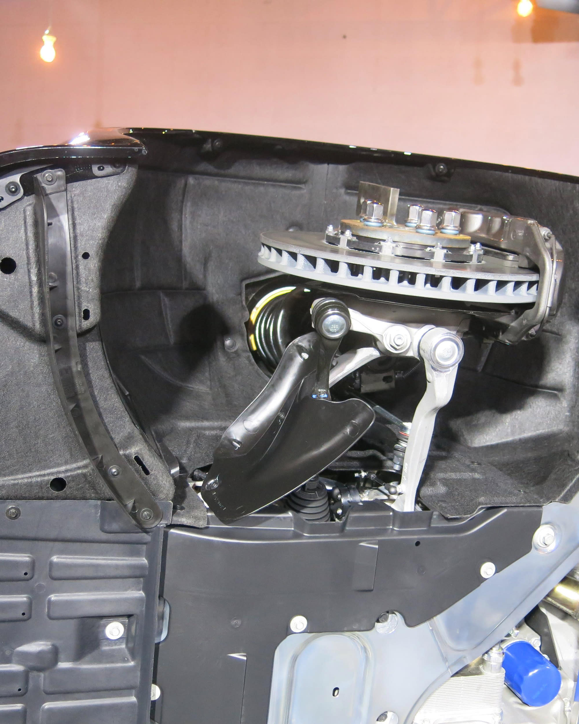 CTS-V suspension (front MacPherson struts, five-link independent rear) benefits by 11% higher front and rear spring rates and fatter anti-roll bars—increased from 25 to 27 mm (0.98 to 1.06 in) in front, and 23 to 26 mm (0.91 to 1.02 in) rear. BWI Group’s Gen-3 Magneride (dual-coil magnetorheological dampers) and unique-to-CTS suspension bushings are tuned to give “flat, predictable cornering with excellent ride quality,” according to Roma. He added that the rear toe-control links use metal-sphere "cross-axis" bushings that offer virtually no deflection.
