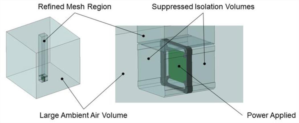 The TMS was then modeled. Aluminum blocks were placed around the internal CCHP to spread the heat across the evaporator and condenser sections. A second CCHP was jogged through the wall and kept flush on both sides. On the exterior of the wall a thin aluminum fin stack was modeled with fin spacing configured for natural convection.