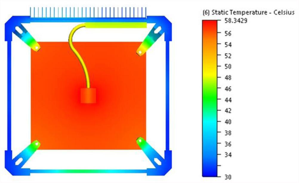 The analysis predicted a maximum temperature on the PCB for this configuration as 58°C. These results were promising, since they demonstrated a solution that keeps the temperature below the 60°C point; here, the power supplies were de-rated.