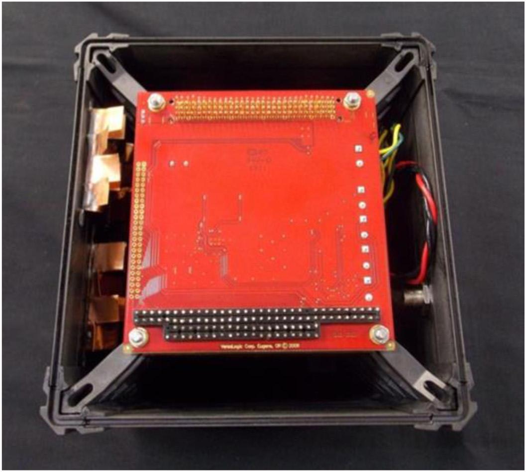 A new CFRP enclosure was developed for the PC/104 form factor that was scalable for various card requirements. PC/104 circuit cards stack vertically, each one plugging in to the next to assemble all the required hardware for the particular embedded computer application. The enclosure design followed this stacking approach, so that the height of the box could be customized for the number of cards to be included for the particular application. Each slice consisted of four CFRP walls and four corner pieces. Typically one wall will have pass-through connectors to attach input and output cables.