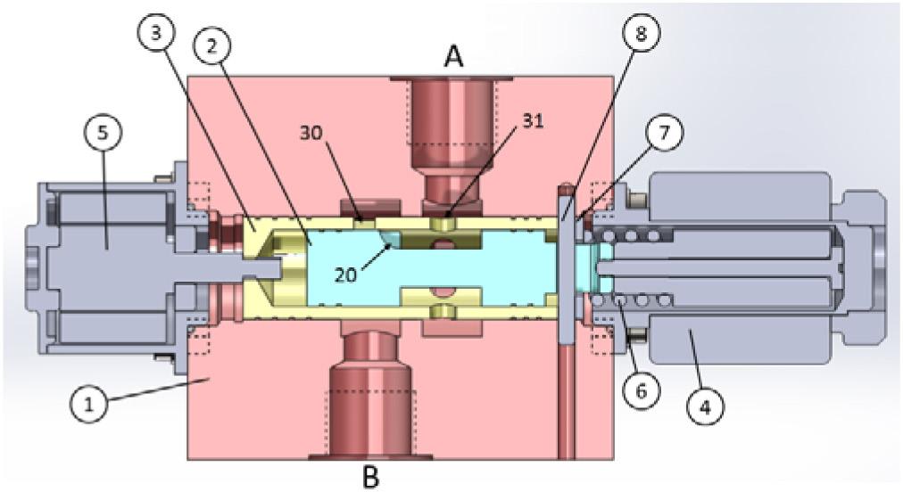 The control of the valve is realized by the mutual movement of the spool with respect to the sleeve. The mutual position of the spool notches with respect to the sleeve windows determines the metering area, controlling the flow between ports (A) and (B).