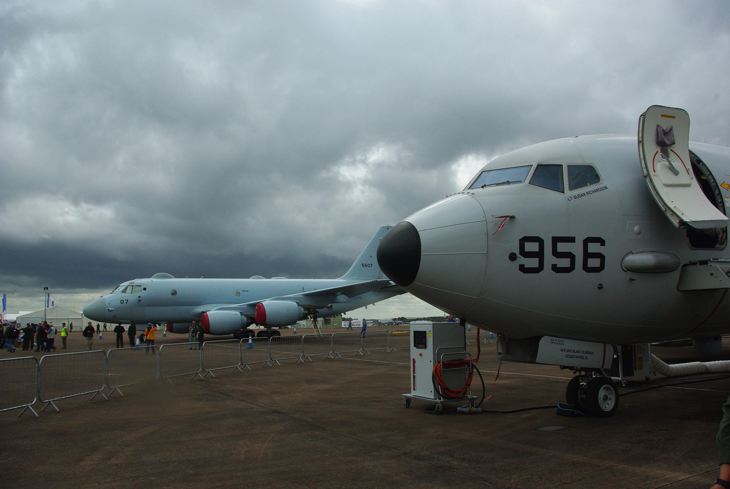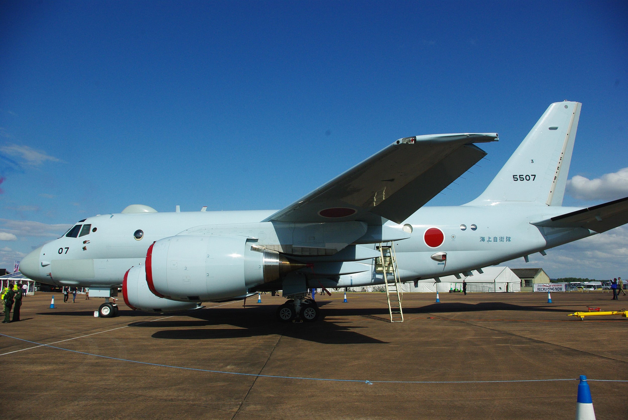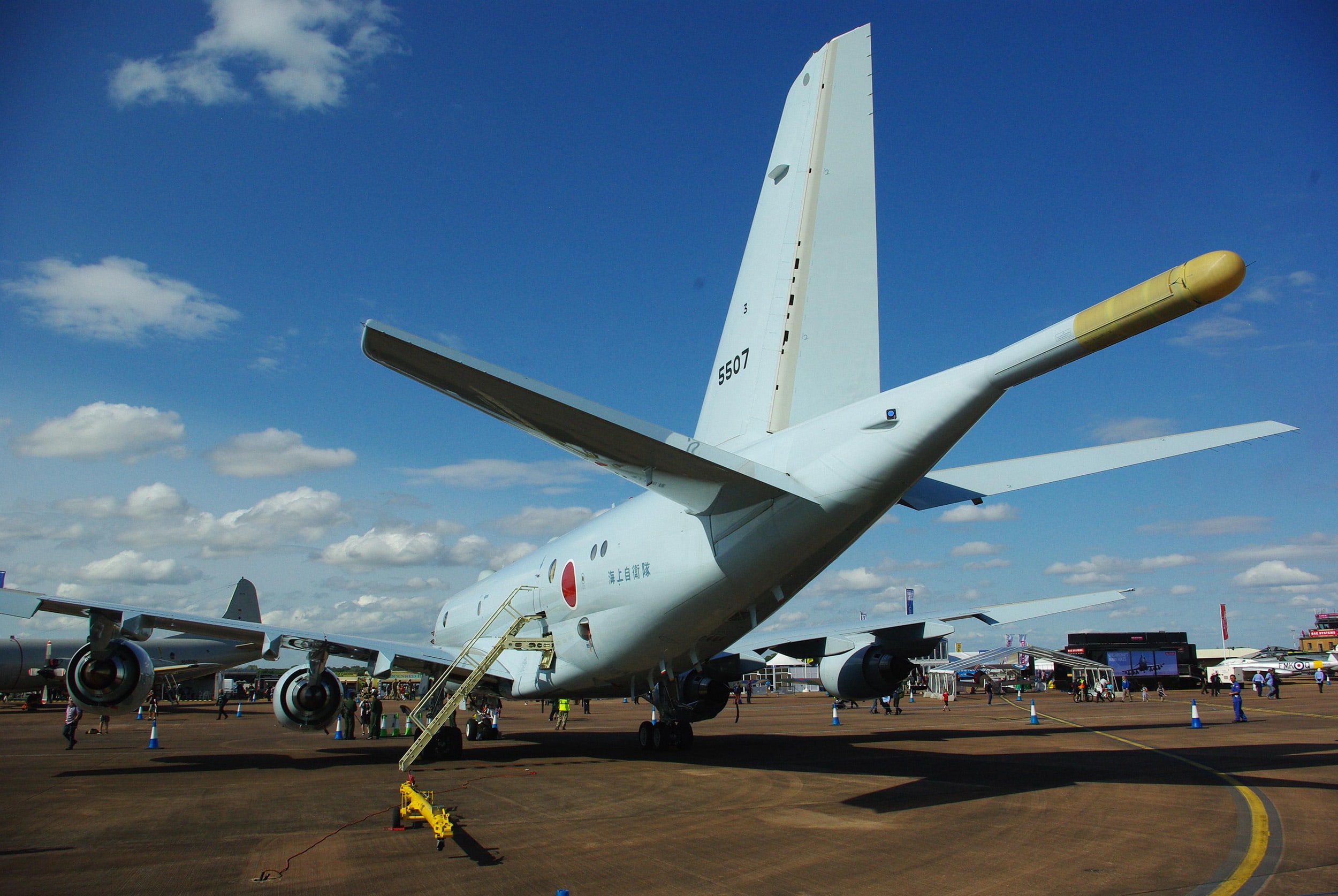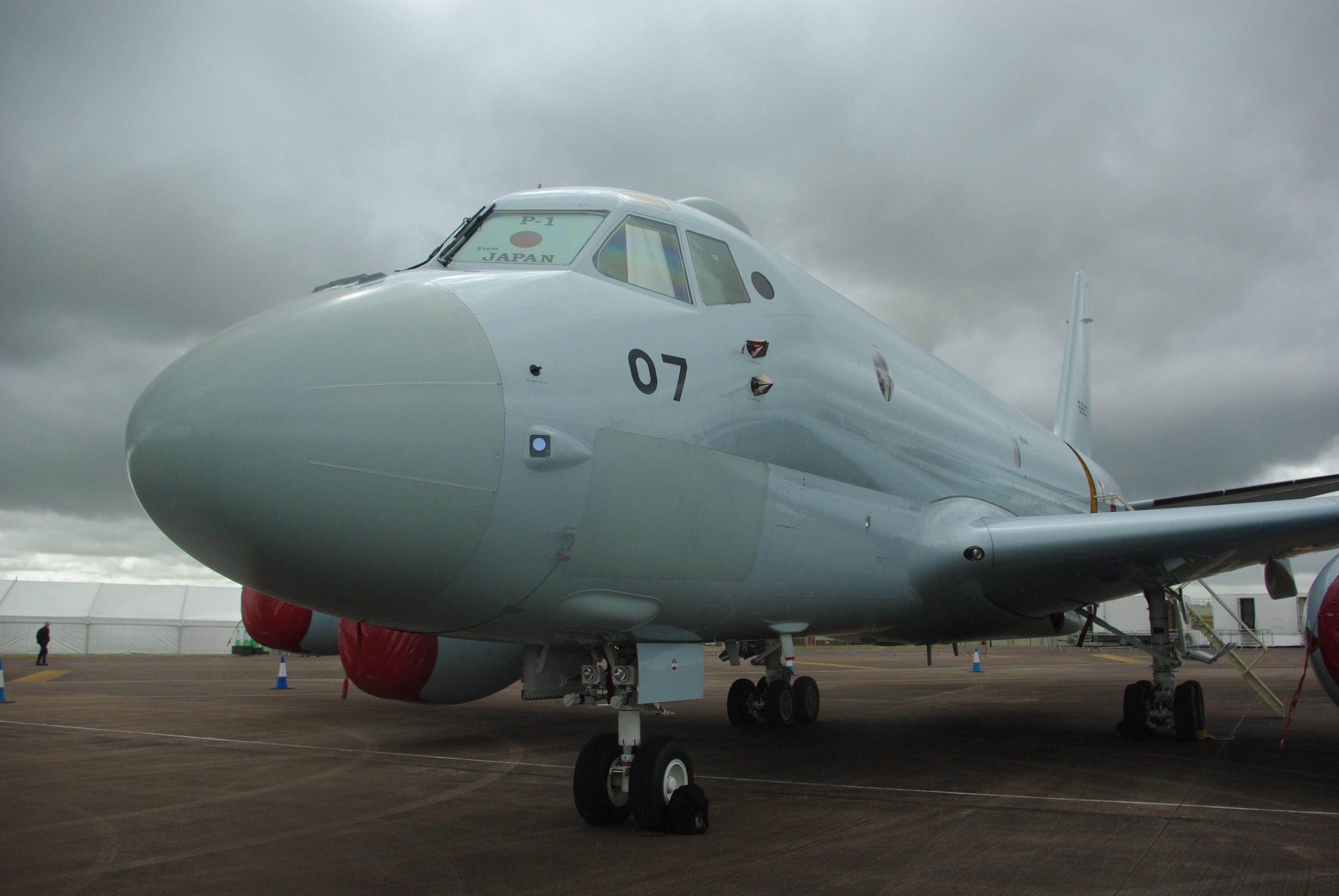 The two aircraft brought to Europe were not fitted with in flight refueling probes and with what appeared to be a satellite communications dome just behind the cockpit, there did not appear to be provision or space for a boom refueling receptacle on the upper front fuselage. The first flight of the prototype P-1 took place at Gifu Air Base in Japan in September 2007 and the first production-standard P-1s from an initial batch of 20 entered Japanese military service in 2013.