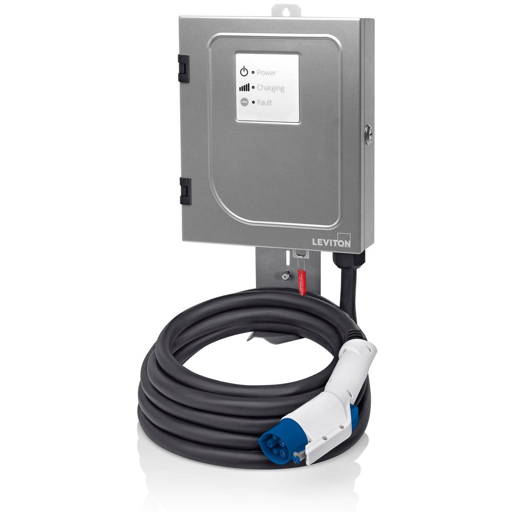 The Evr-Green charging station from Leviton delivers up to 7.7 kW of power for home and workplace. The updated device provides up to 32 A at 208 or 240 V ac (7.7 kW maximum output) and is designed with an improved installation process to better meet customer needs and to reduce the charge time of next-generation SAE J1772 plug-in electric vehicles, according to the company. The Evr-Green 320 Level 2 Charging Station features a unique charge connector assembly that is rated up to 40 A and a durable, weatherproof NEMA Type 4 steel enclosure. The unit is available in a hard-wired installation, and can be cord-connected and mounted to the Leviton installation kit if required. The charging station is also available with either an 18-ft or 25-ft charging cable. The station is constructed of powder-coated galvanized steel to withstand harsh environmental conditions, and it is designed to be installed on a wall or be freestanding with a single or dual pedestal system.