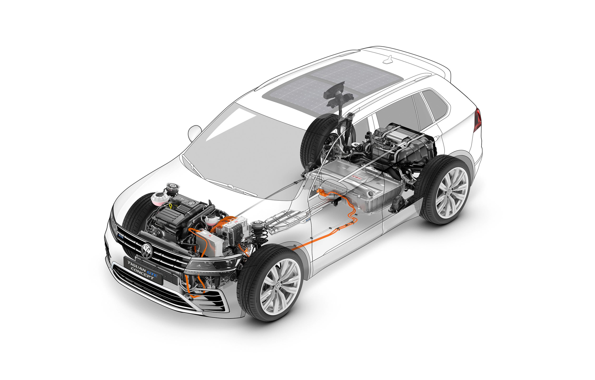The 13 kW·h lithium-ion battery pack can propel the Tiguan GTE concept 31 mi (50 km) on electric power alone, with an electric top speed of 130 km/h (81 mph). Using the electric motor to boost the gasoline engine’s performance produces an available top speed of 200 km/h (124 mph) and 0-100 km/h (0-62 mph) acceleration of 8.1 s.