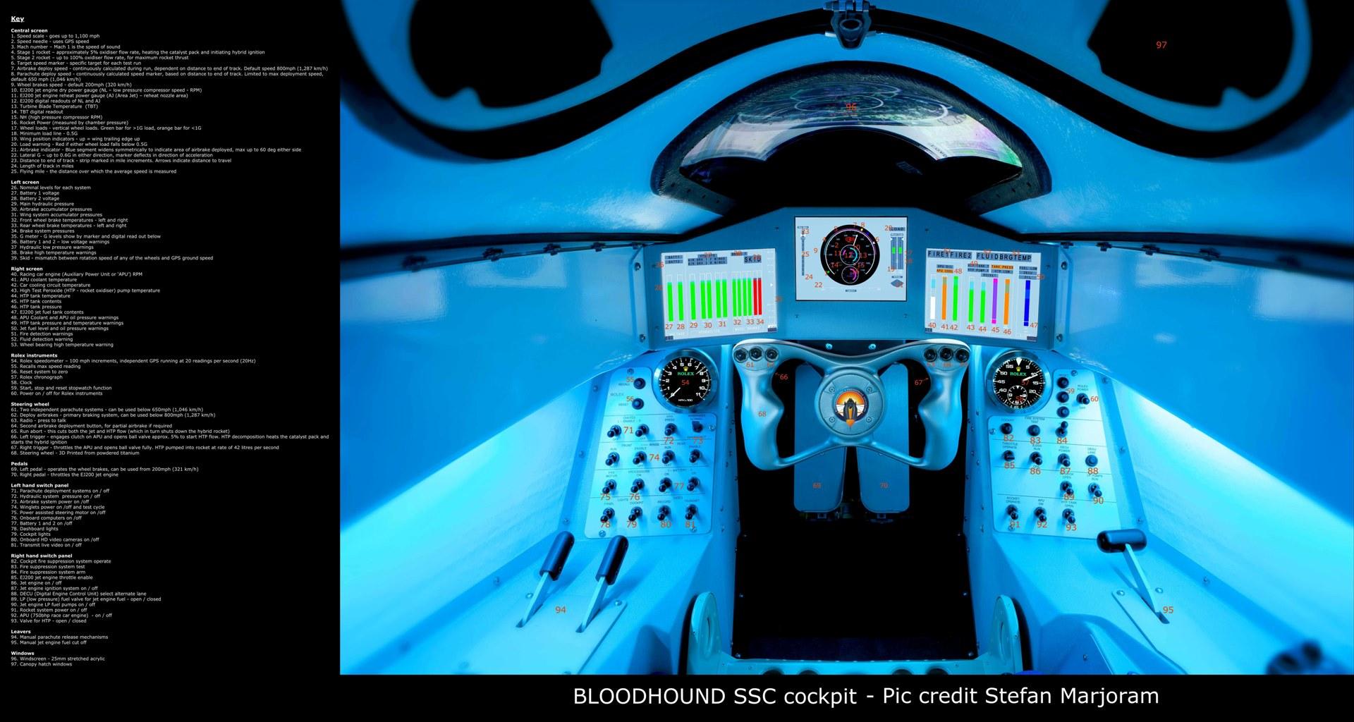 The Bloodhound’s cockpit layout was designed around the requirements of its driver, the current World Land Speed Record holder, Royal Air Force fighter pilot, Wing Commander Andy Green. It includes three screens providing various engine data, an F1-style steering wheel with systems’ operating buttons, a foot throttle for the jet engine, and a brake pedal.