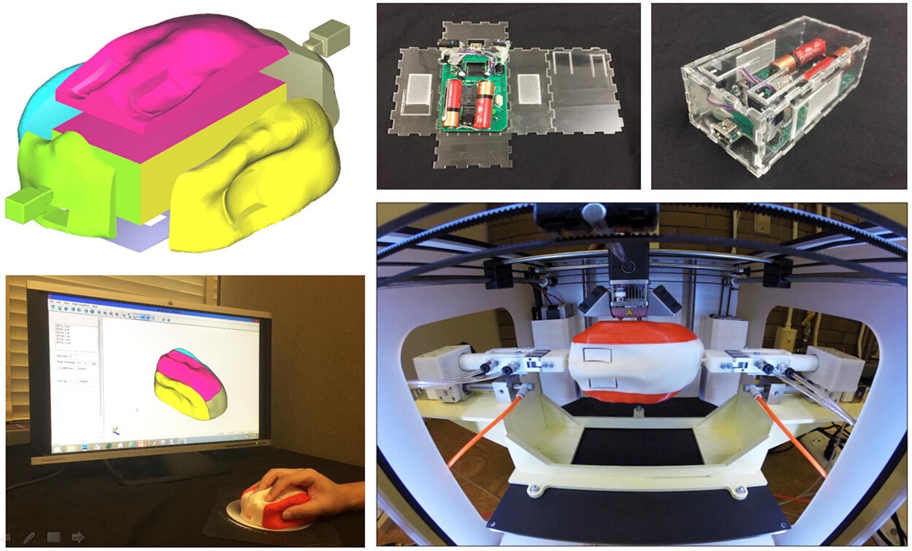 The new system has been demonstrated by creating items with complex shapes, using different colors to show how the segments are printed separately but in a continuous process as the piece is turned and repositioned. In one project, a mouse was tailored to a person's hand by first creating a clay mold and then scanning it into a computer. The mouse was fully functioning out of the printer.