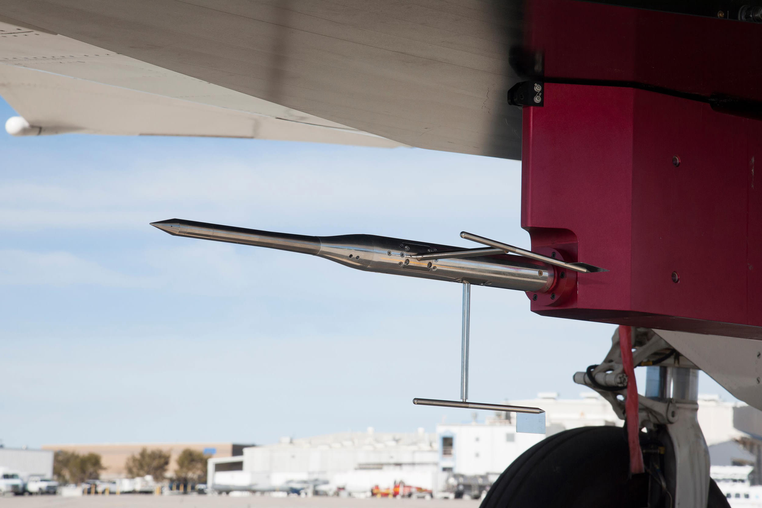 "You want to have minimal lag in your measurement system to accurately characterize the intensity of the shockwave," said Mike Frederick, NASA Armstrong Principal Investigator of the Eagle Aero Probe. "With this probe, pressure changes are seen almost immediately because the pressure sensors are located within about four inches of the pressure ports on the nosecone. For comparison, on the F-15B nose boom, which has been used for air-to-air probing in the past, the pressure transducers are located back in the radome, approximately 15 feet behind the pressure ports."