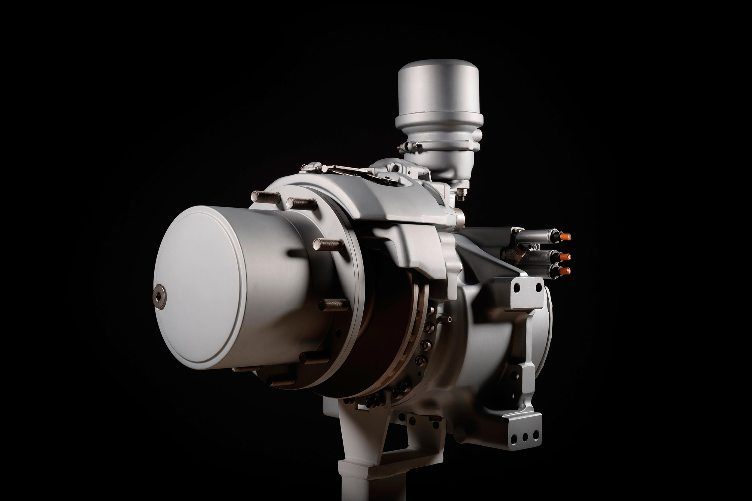 The drive axle is based on a modified ZF AVE 130-400 V AC electric portal axle, similar to that used with Mercedes-Benz hybrid buses, with a weight rating of 11.5 tonnes (25,350 lb). This axle does not employ hub motors; instead, it uses liquid-cooled asynchronous traction motors mounted inboard of the brake assembly. Each motor can deliver a total output of 125 kW at a maximum of 11,000 rpm, with a continuous rating of 60 kW. Daimler quotes maximum torque from standstill of 500 N·m (369 lb·ft). Two-stage reduction gears can deliver up to 11,000 N·m (8110 lb·ft) per wheel. At a gross weight of 25 tonnes, Daimler indicated each motor can deliver a traction force of 22 kN on a 17% uphill gradient.