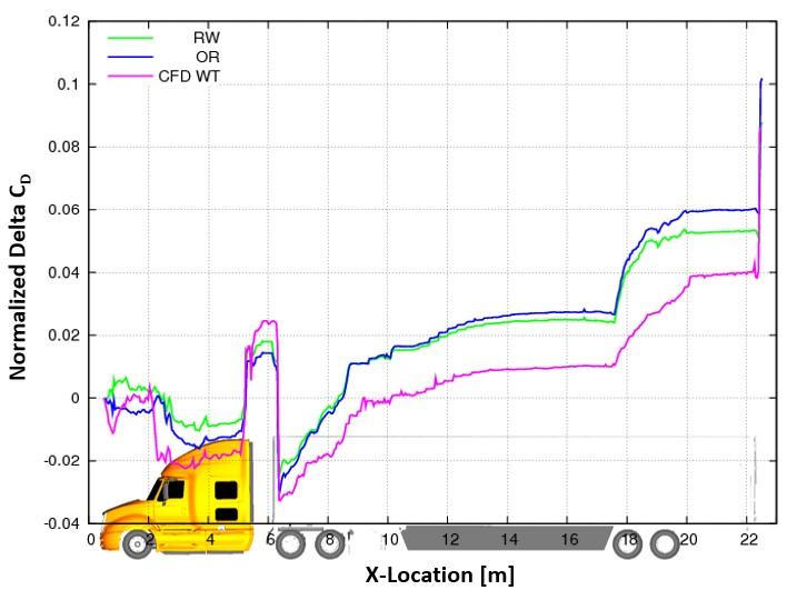 Asymmetric drag polar existed between the positive and negative yaw angles due to the different clearances to the side of the test section itself and/or to some extent of the test vehicle upper body and underhood components. A significant shift in the normalized CD (total linear drag coefficient) between the tunnel simulation and the OR simulation was seen. The tunnel boundary conditions affected the shape of the yaw curve and reduced the model’s sensitivity to yaw effects. Drag effects of yaw were less pronounced in the WT.
