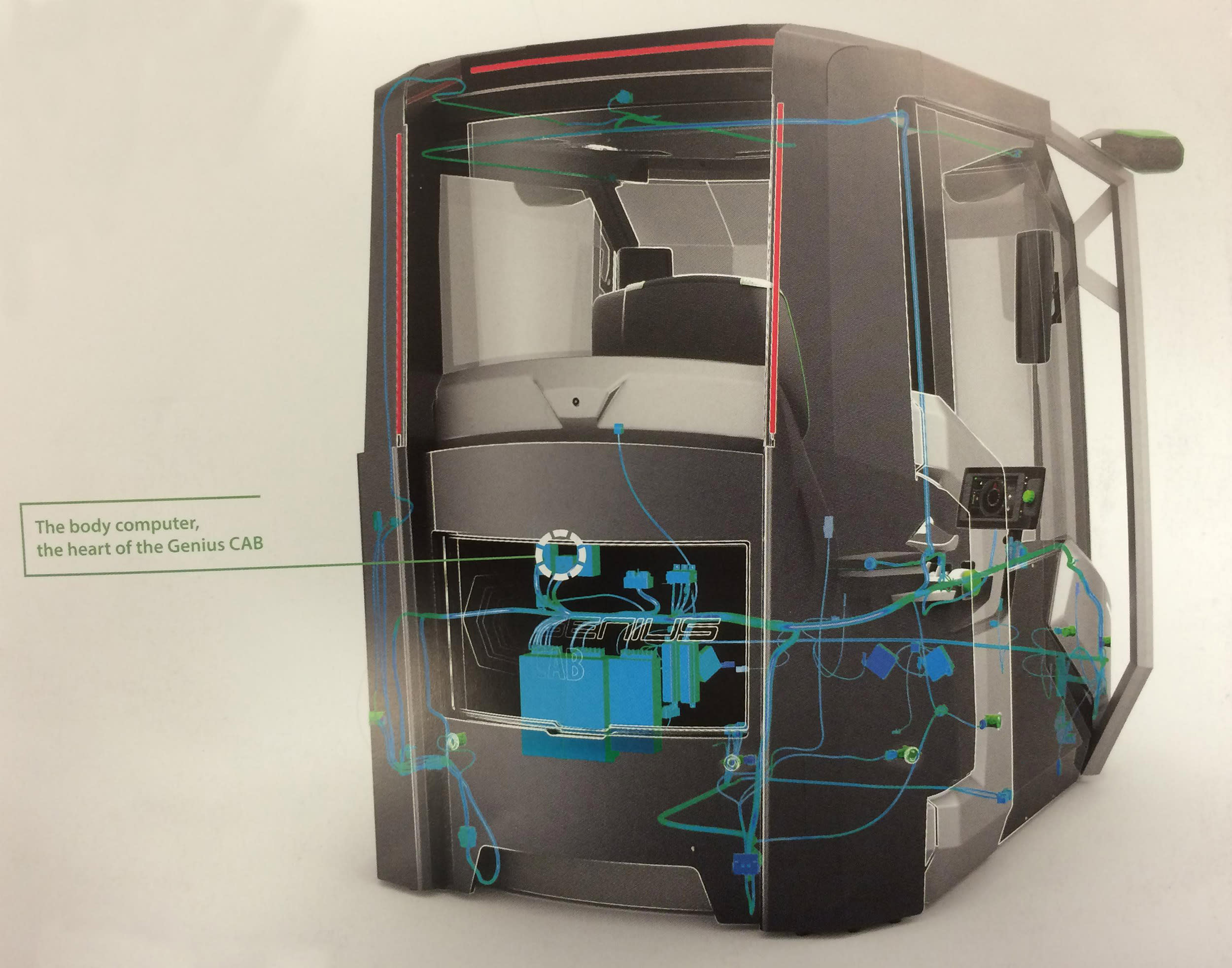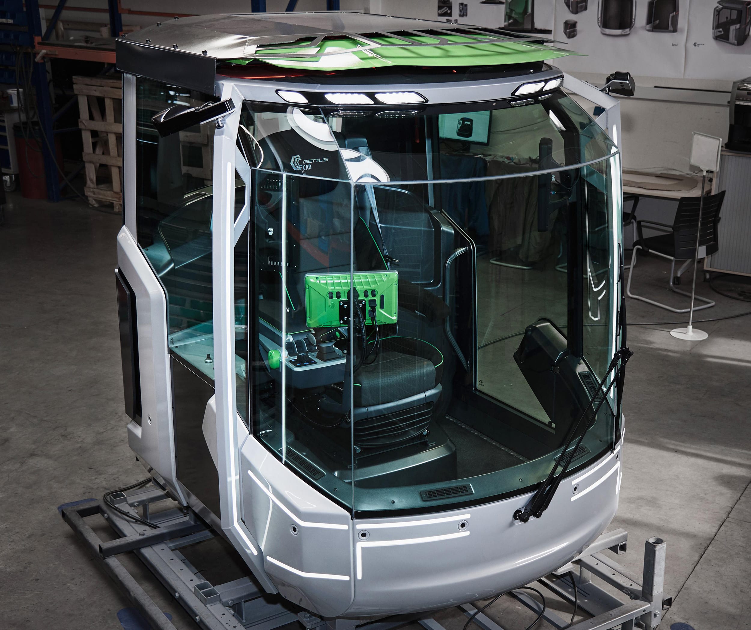 Robert Bosch is one such company. The Tier 1 contributes the body computer, which enables centralized control of the sensors and actuators via CAN (SAE J1939), LIN or directly, as well as the ultrasound sensors integrated into the exterior of the Genius CAB to detect dangerous situations by displaying relative positions and nearby obstacles. The information is communicated to the operator via the display terminal and a Hella ScenarioLight installed in the roof.