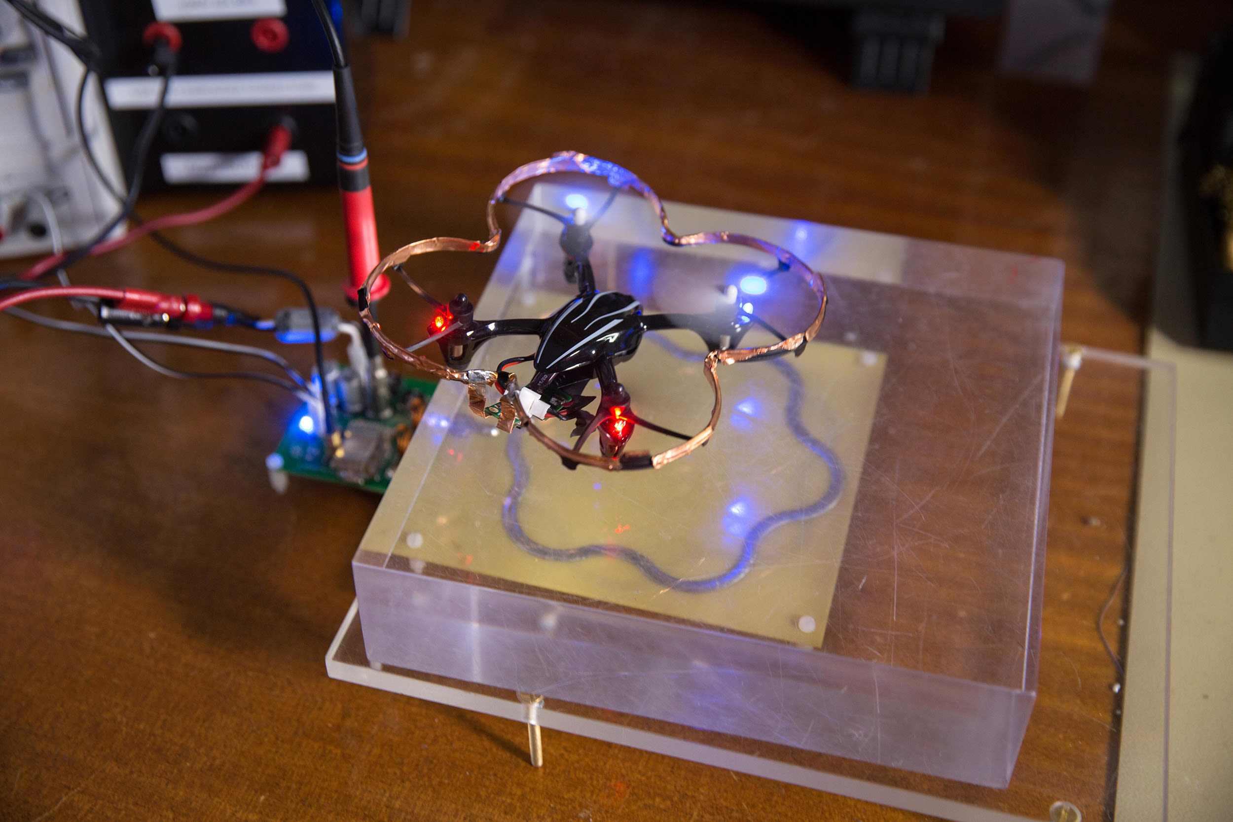 To demonstrate their approach the researchers bought an off-the-shelf quadcopter drone, around 120 mm in diameter, and altered its electronics and removed its battery. They made a copper foil ring, which is a receiving antennae that encircles the drone's casing. On the ground, a transmitter device made out of a circuit board is connected to electronics and a power source, creating a magnetic field.