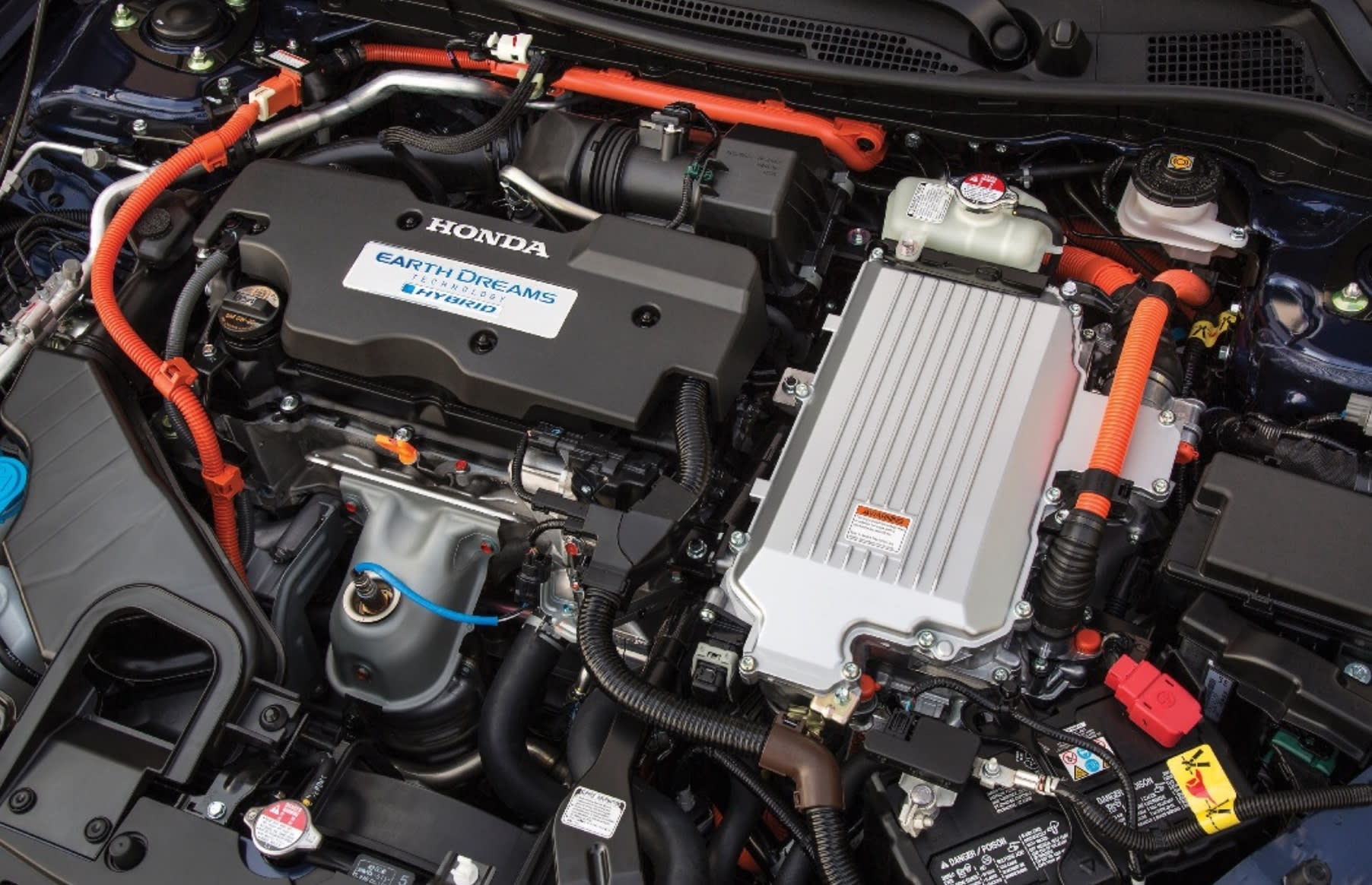 The key difference between the plug-in (PHEV) and hybrid version — besides the presence of an onboard charging system and cord for the PHEV — is the size of the onboard battery. the Accord Plug-in hybrid uses a 6.7-kW·h lithium-ion pack, whereas the new hybrid model employs a more compact 1.3-kW·h pack that is charged via the 2.0-l “earth Dreams” Atkinson-cycle gasoline engine, regenerative braking, or a combination of the two.