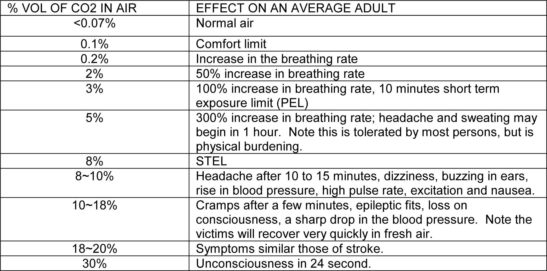 ASHRAE (American Society Heating, Refrigeration and Air Conditioning Engineers) says the comfort limit for CO2 concentration is 700 ppm over the ambient level, which is approximately 400 ppm, for a total of 1100 ppm (0.11%).
