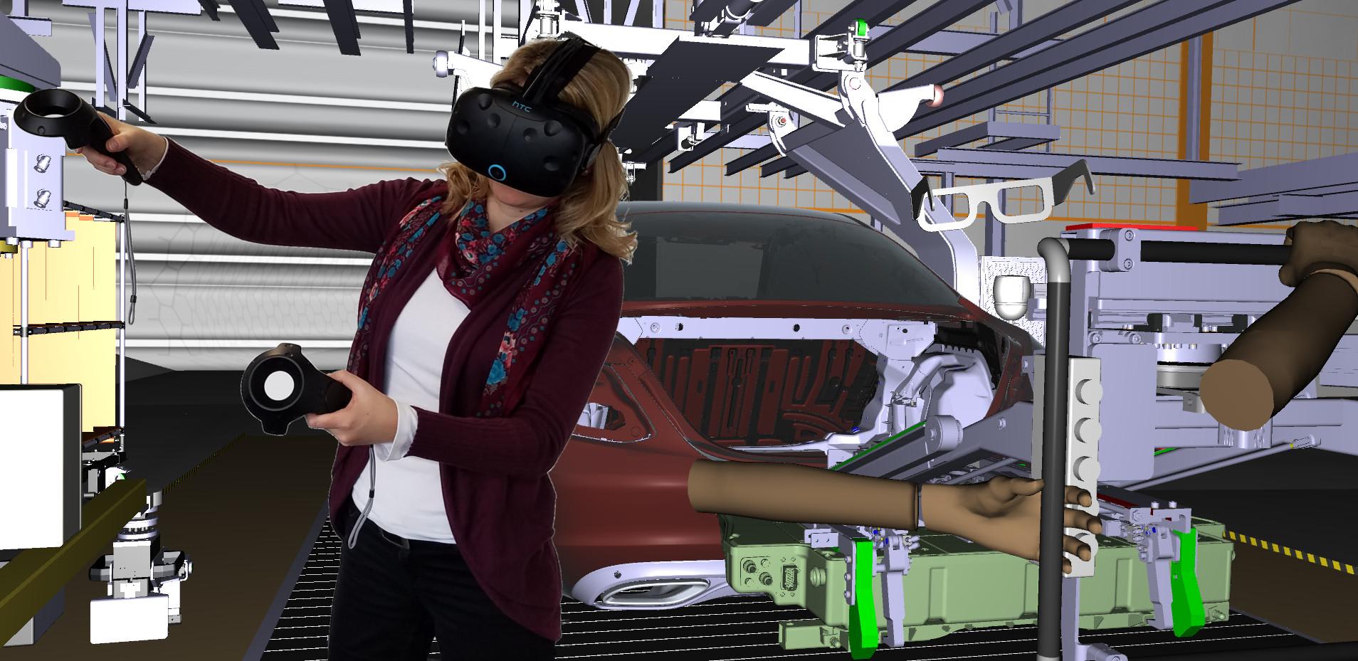 A demonstration amply proved that one feels truly immersed in a virtual world when wearing head-mounted displays and using hand-like grips to move and manipulate objects. In many instances, the demonstration proved interacting with the virtual world indeed was intuitive and effective in understanding how parts move and fit with one another. The system did not include haptic cues which would have been useful; Kam noted that both ESI and the community at large is working to incorporate haptic feedback.