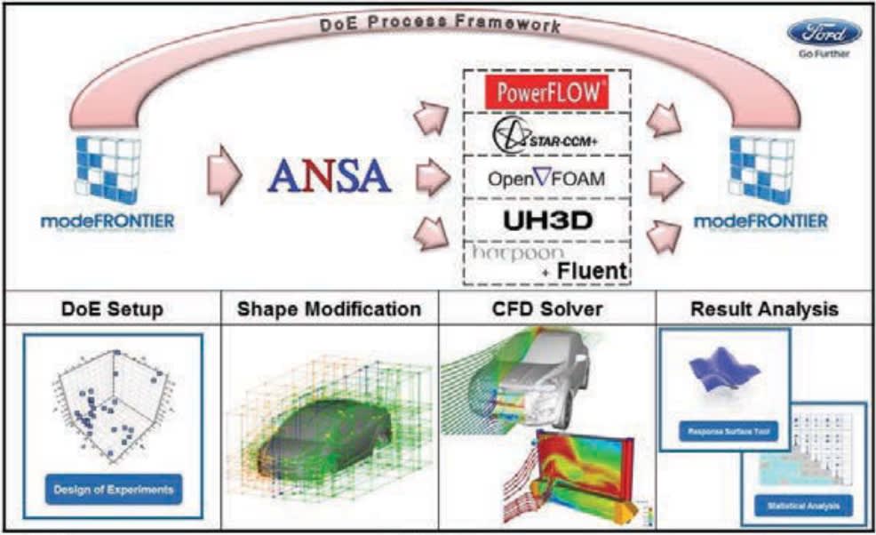Toward that end, Ford is now identifying how best to use CFD to explore the most important and dependent parameters in an emerging vehicle design. Hupertz believes that CAE-based design of experiments (DOE) is the best solution. DOE allows them to explore the effect of a large number of design parameters on vehicle shape and system performance. Optimization software packages that carefully plan out the best use of hundreds of runs are key. Also key is a sophisticated morphing tool to help designers understand how they can best improve the vehicle shape. Finally, “we have put a lot of effort into friendly user interfaces so that designers and artists can understand and visualize what we aerodynamics engineers are talking about,” said Hupertz.