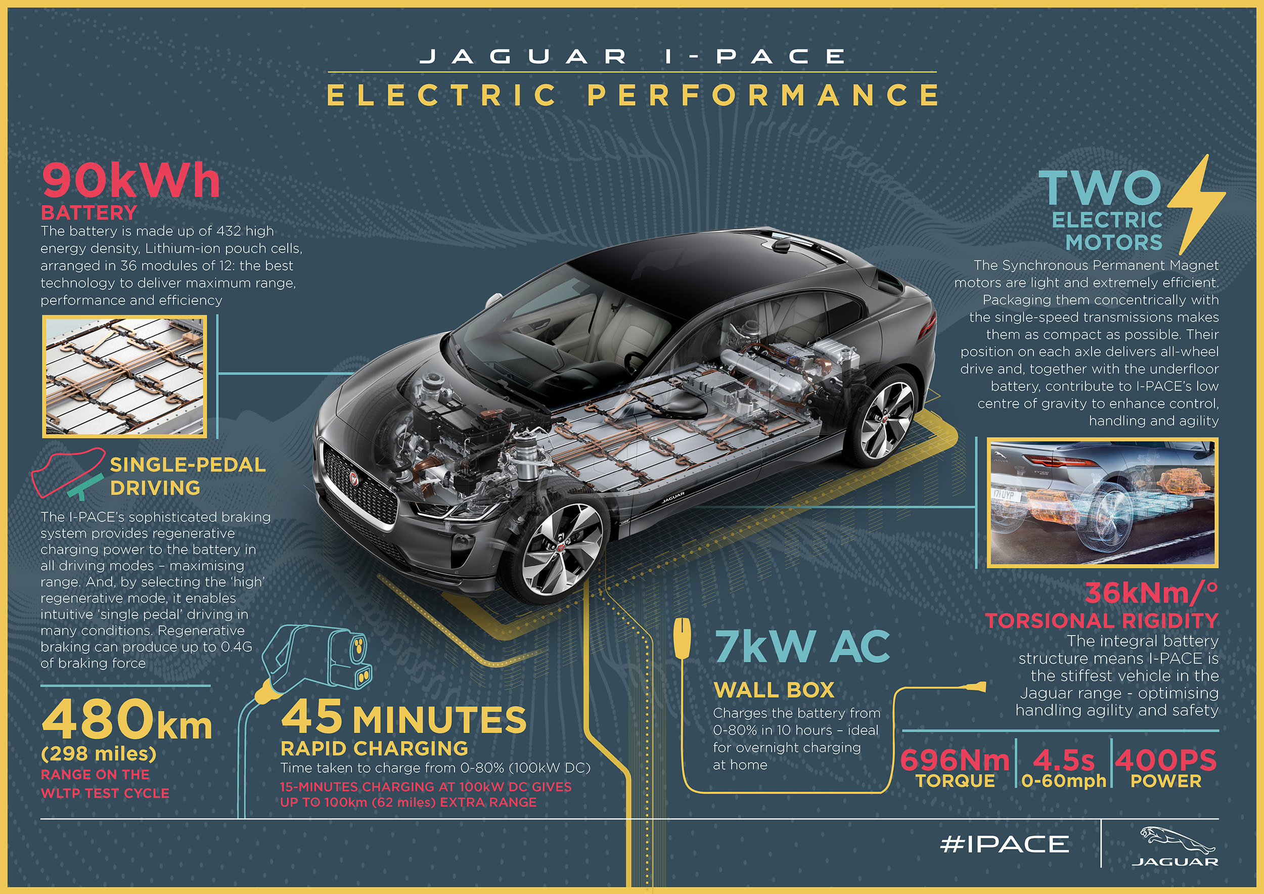 The 90-kWh liquid-cooled lithium-ion battery pack uses pouched cells (432 in 36 modules). To control cell temperatures and maximizes available power, the battery pack has a cooler for operating in moderate temperatures and a refrigeration unit linked to the vehicle’s air-conditioning system to cope with higher thermal-dissipation requirements. A heat pump operates in cold conditions to look after the cells as well as to condition the I-Pace interior, drawing energy from outside and using heat scavenged from the electrical system’s inverters and power electronics, all of which can bring a range bonus of up to 50 km (31 miles). The battery has a pre-conditioning system (when the vehicle is plugged in) to manage its temperature to maximize range from journey start—andJaguar states that the I-Pace has been tested to operate in temperatures down to -40o C.