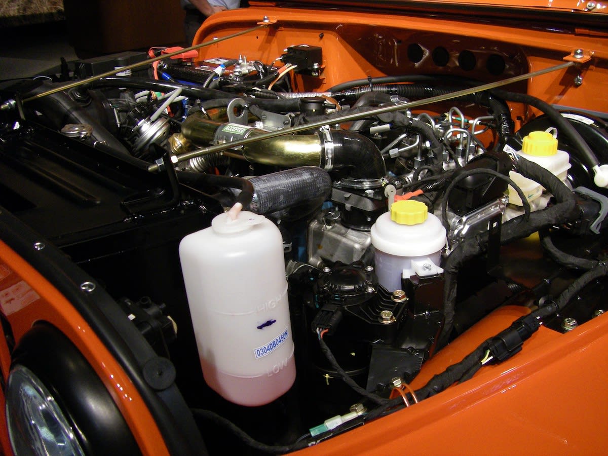 The vehicle is powered by a 2.5-L turbodiesel, direct-injection 4-cylinder Mahindra engine (m2DiCR) that produces 62 hp (46 kW) at 3200 rpm and 144 lb·ft (195 N·m) at 1400-2200 rpm. Engine mates to a Mahindra 5-speed manual transmission. “It’s a conventional automotive-style transmission. Most vehicles in the side-by-side segment use a CVT (continuously variable transmission),” Haas said.