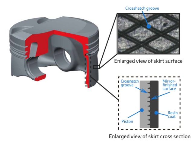 Low-friction pistons feature laser-crosshatching in their resin-coated skirts for reduced friction. Other technologies aimed at higher efficiency include the use of an electronic thermostat to precisely control the coolant temperature for efficiency under all conditions, and an electric water pump ensures that the water pump only spins quickly when it needs to.
