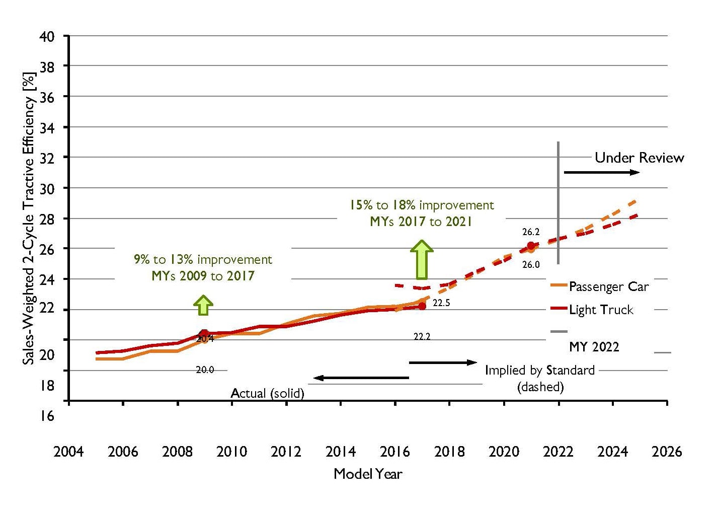 Pannone’s Novation Analytics research and consulting firm uses a metric it calls “tractive efficiency” to measure the relative efficiency of vehicle powertrains, controlling for other efficiency-related aspects of light-vehicle design such as mass, aerodynamics, rolling resistance and other factors. He said that although light vehicles are making steady and meaningful progress in improving tractive efficiency, the current pace of improvement will fall short of federal Phase 2 emissions regulations governing the 2017-2025 model years.