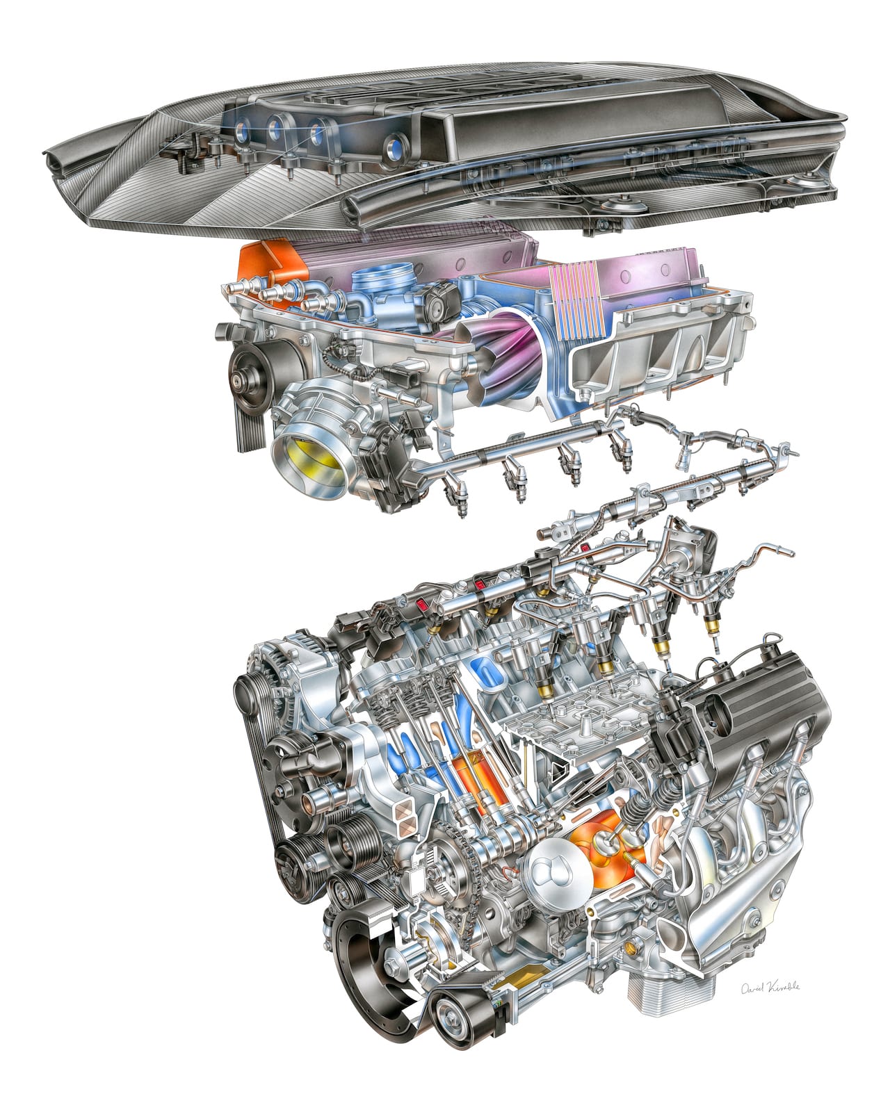 To increase peak output by 105 horsepower and maximum torque by 65 lb·ft (88 N·m) versus the LT4, most of the components topping the LT5 engine are new: