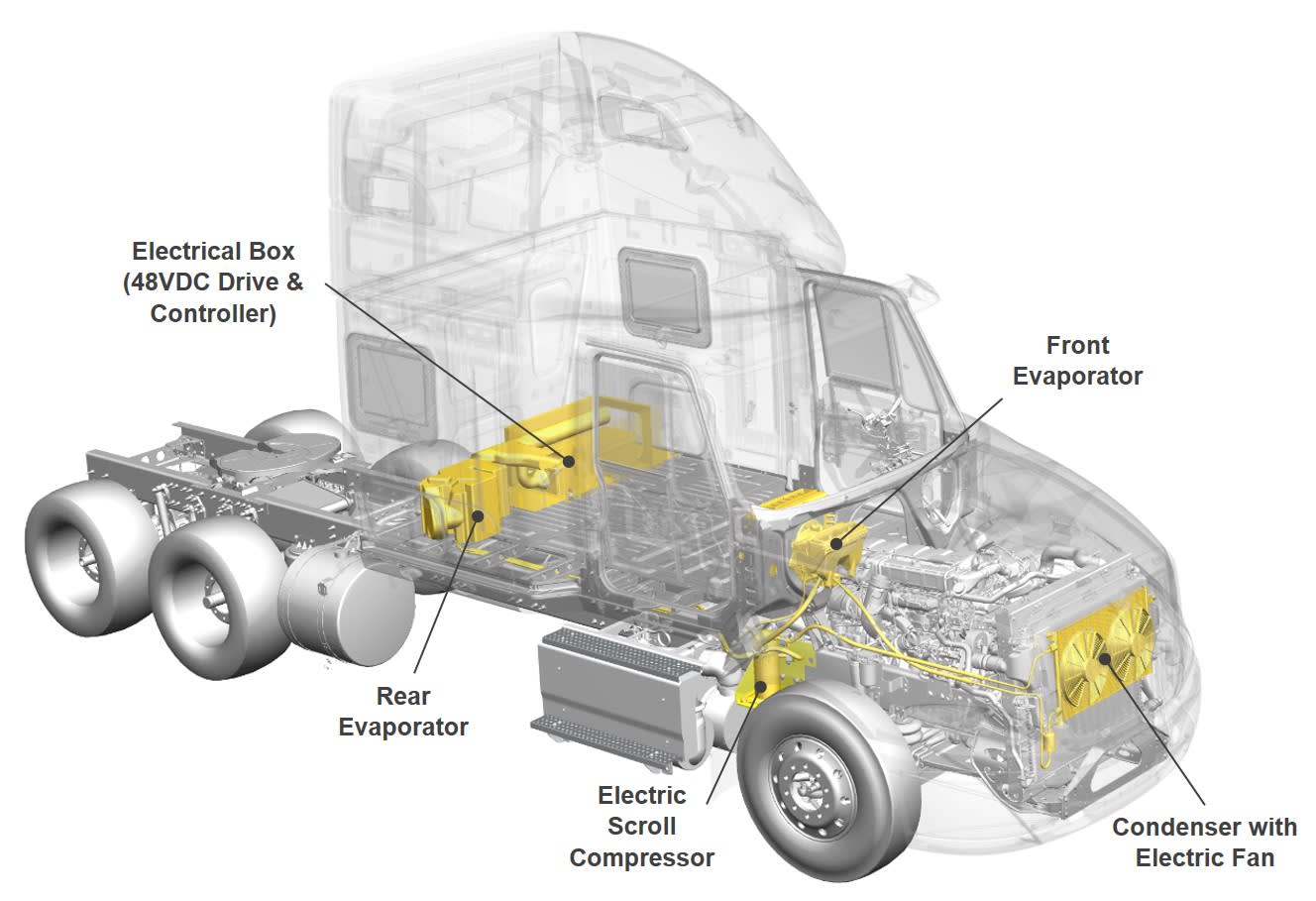 A conventional Class 8 commercial truck with sleeper cab has a compressor under the hood for the driver’s heat and A/C, and an auxiliary power unit with its own fuel source to heat and cool the sleeping area.