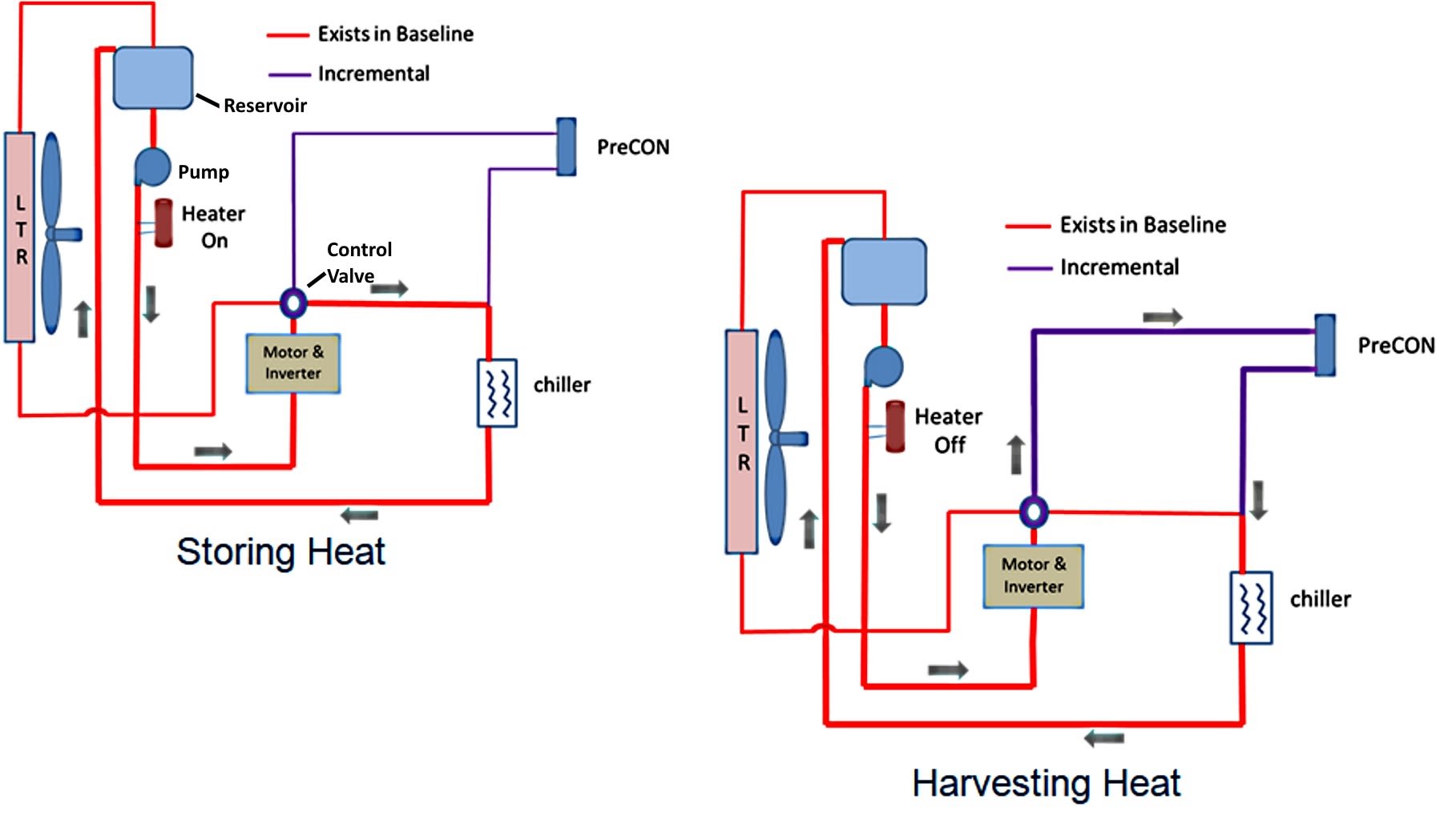 Hanon modified the Soul BEV by adding two valve-connectible glycol coolant circuits, each with a heat exchanger and total fluid capacity of 2 l (0.5 gal). One heat exchanger contains a 1500-watt electric heater that also produces source heat for a cabin pre-conditioning heater core. During vehicle operation, that electric feed is turned off and the heating system uses the stored heat and additionally gleans waste heat from the motor/electronics circuit—a heat source that continues to be available when stored heat is depleted.