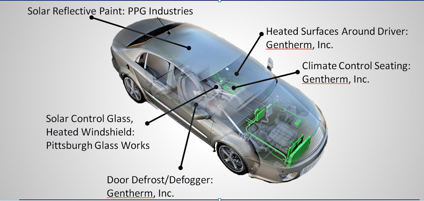 Two Sonata PHEVs were used: one unmodified, the second with a special thermal-reduction package: Pittsburgh Plate Glass supplied an electrically-heated windshield, solar reflective glass and solar reflective paint; Gentherm provided heated surfaces around the driver, door glass demisters and climate-controlled seats. The special seats, glass and paint were found to impact both heating and cooling.