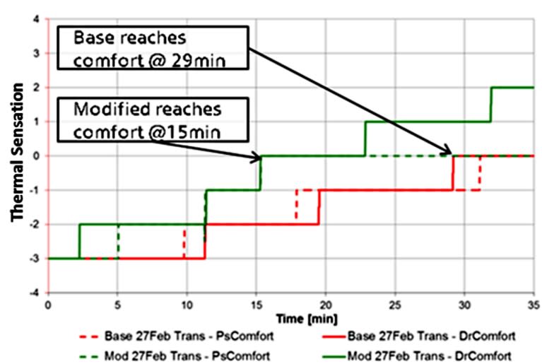 The comfort measurements were based on passenger-reported sensations. The researchers noted that the driver and passenger could turn down the set points for heat and A/C because their comfort level was achieved with lower energy inputs. In the cold-weather testing, comfort was reached in 15 minutes with the modified Sonata, 29 minutes without the thermal-loading improvements.
