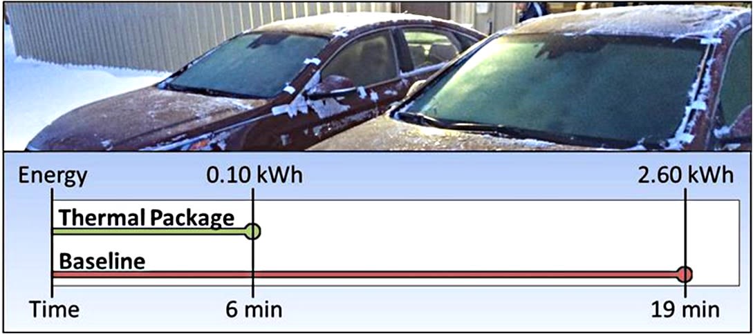 The Fairbanks, AL testing of the windshields was an objective measurement. Electric heating cleared the ice in just six minutes, using 0.1 kWh of electricity. The conventional defroster took 19 minutes and required an electrical equivalent of 2.6 kWh.