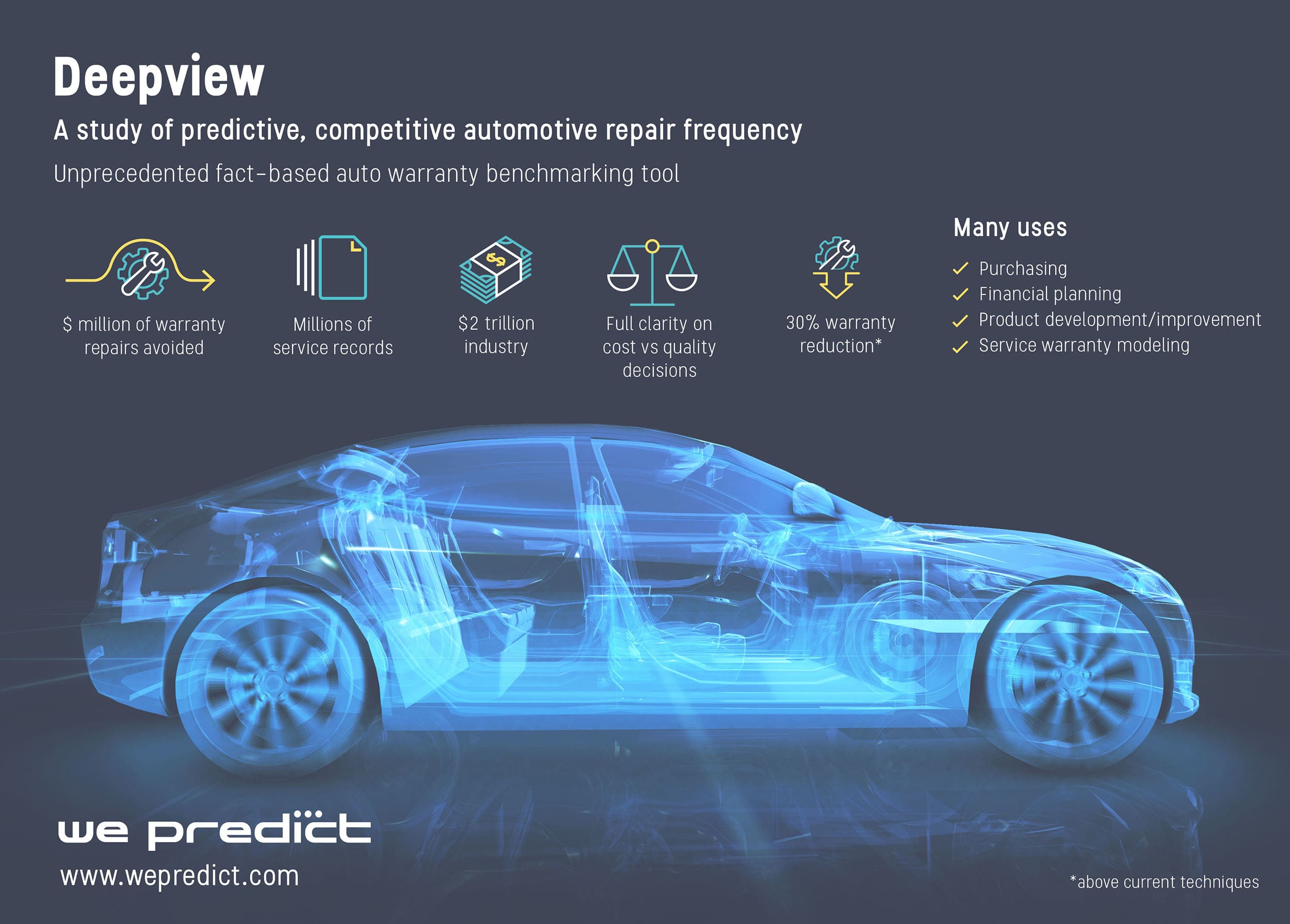 WePredict executives don’t carelessly toss around the overused term “artificial intelligence,” but they do assert machine learning is a part of their new-age data alchemy of “predictive methodology” they promise will open new vistas of understanding about repair frequency for all manner of automotive components. The company’s first wide-ranging study of predictive repair frequency is called Deepview and launches this fall.