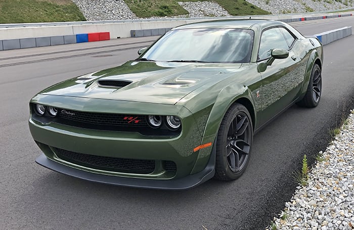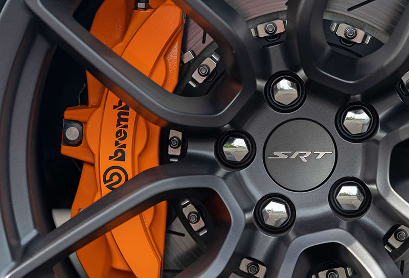 Track-day enthusiasts seeking corners will want to consider the new 2019 R/T Scat Pack Widebody, which features the same wider fenders as Hellcat Widebody models, adding 3.5 in. (89 mm) to the overall width and riding on wider 305/35ZR20 tires. Dodge claims the larger, six-piston Brembo front brakes, wider wheels and tires and suspension upgrades featured on the R/T Scat Pack Widebody equates to a 2-s faster lap time at a 2.1-mile road course, compared with the non-Widebody Challenger R/T Scat Pack.