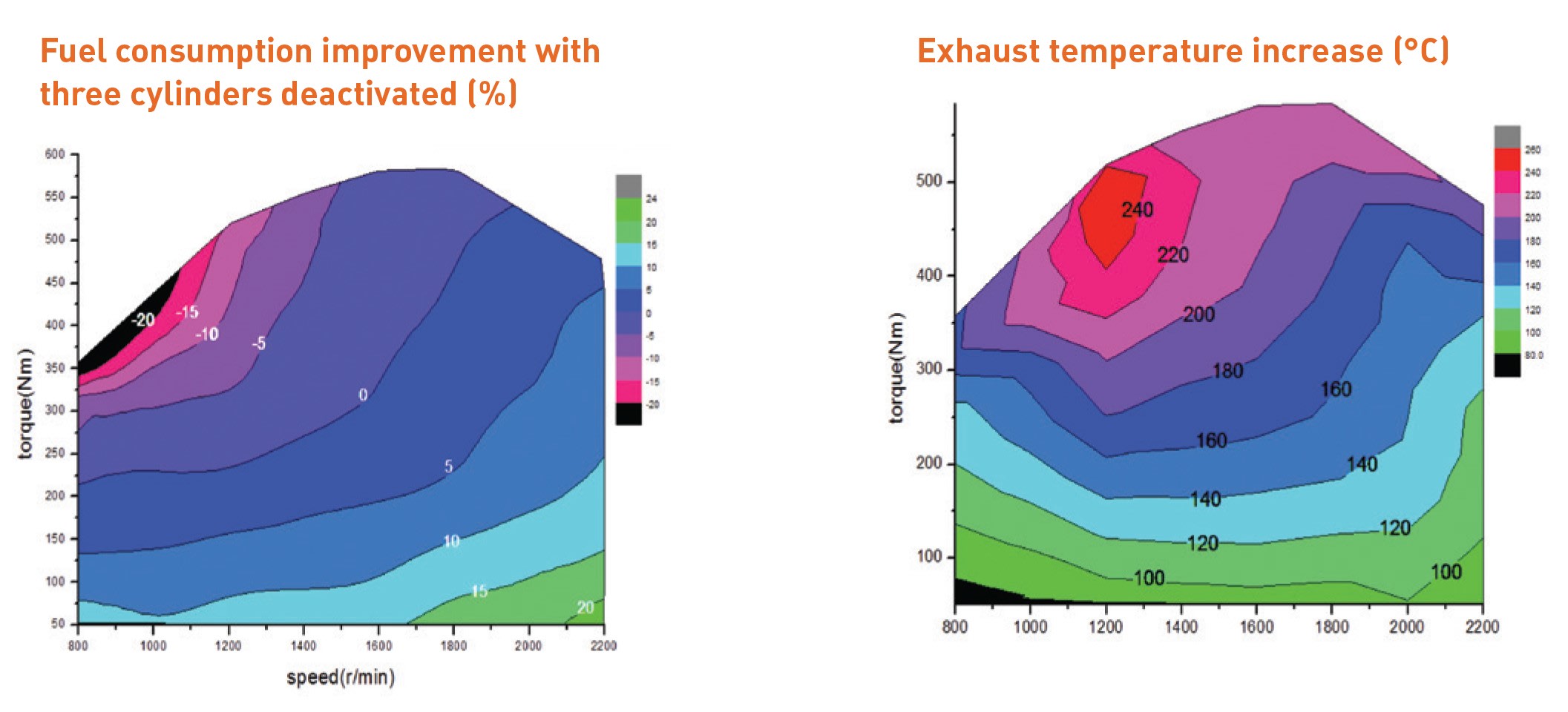 At the lowest engine loads and with three of six cylinders deactivated, fuel consumption improves by up to 20%, the company claims. During vehicle coasting, CDA can be applied to some or all cylinders to further reduce the air mass flow going through the aftertreatment system to reduce both the cooling and the engine pumping losses.