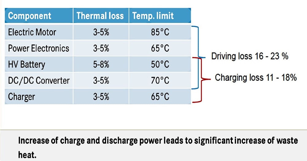 The DC-DC converter, power electronics, and battery charging/discharging cycles produce significant amounts of heat. And there are electrical energy losses that may total up to 40%, noted Alfred Jeckel, an engineer in high-voltage battery design and testing at Daimler. The need for liquid cooling to carry away heat is there.