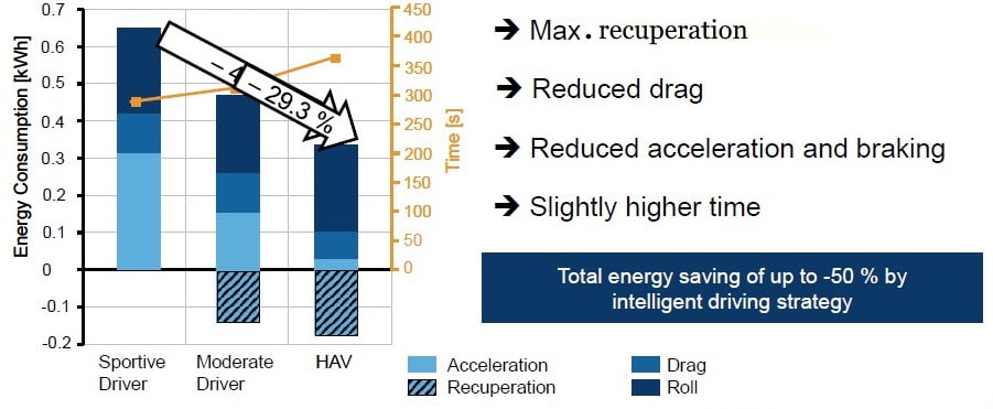 The IAV simulation results that showed maximum improvement with HAV control (50%) were compared to “sportive” urban driving. A “moderate” human driving style could approach the HAV results according to the IAV study, indicating value in driver-training algorithms available in some BEVs. However, the computer still delivered a significant improvement over the moderate driver via regenerative braking, vs. none for the sportive driver.