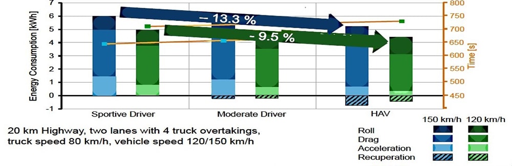 Although the range increase was not as dramatic for the HAV in a two-lane highway driving comparison, it still was worthwhile, ranging from 6.5% to 13.3%. Two simulations were run, one at 120 km/h (72 mph), a second at 150 km/h (90 mph). Four trucks traveling at 80 km/h (48 mph) were programmed into the simulation, with the HAV overtaking them. In both cases, there was worthwhile recuperation (regenerative braking) derived from the HAV, none from the sportive driver and only a minor amount of “regen” from the moderate driver.