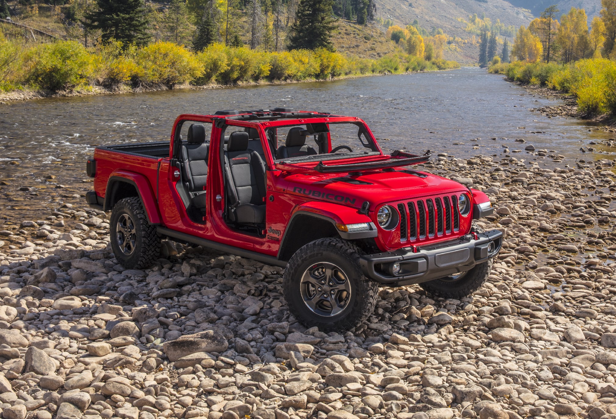 There is all manner of ways to configure the doors and roof, including body-color panels for the 3-piece hardtop on some trims; as with the Wrangler, the windshield of the Gladiator can be folded down onto the hood.