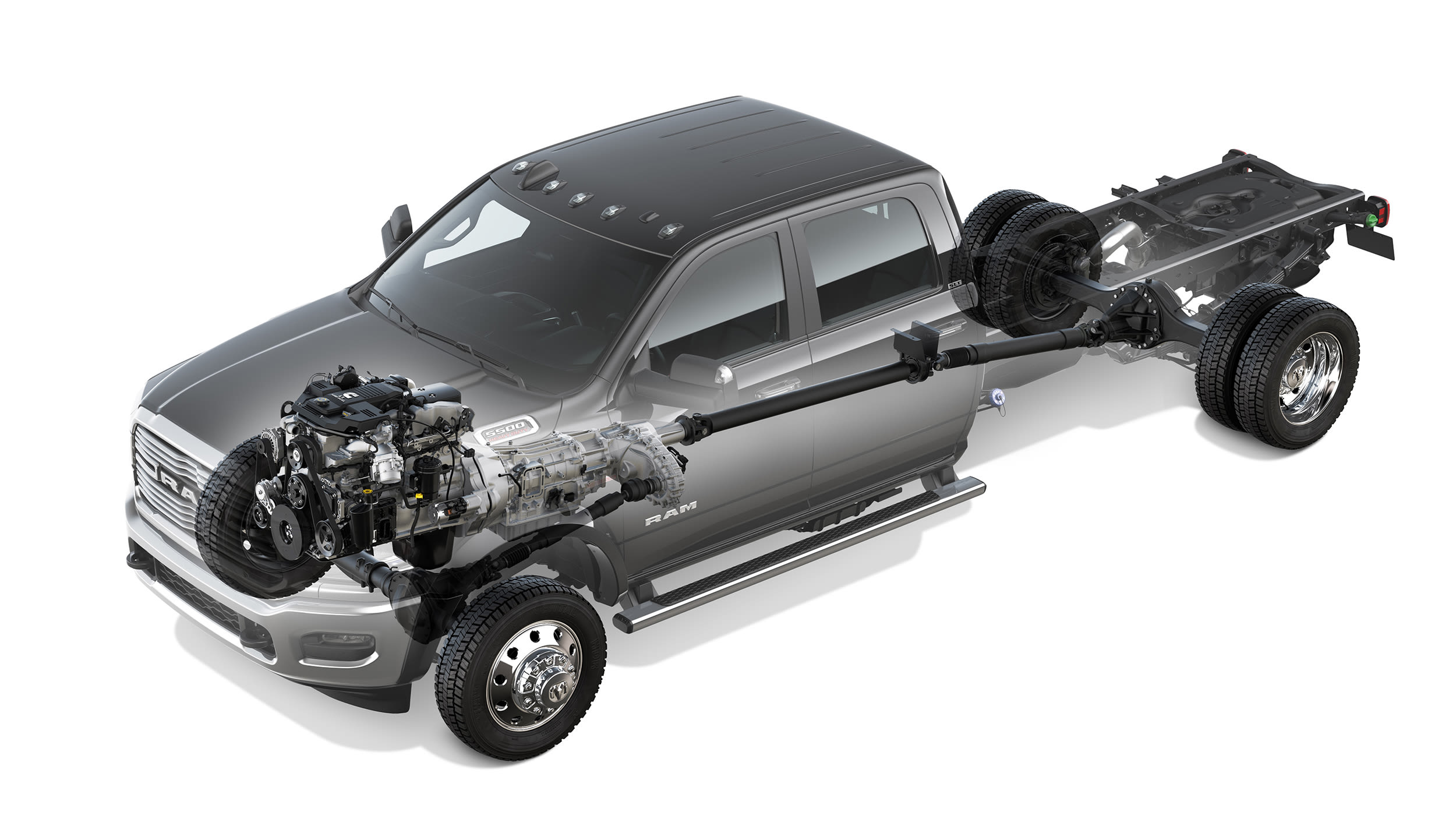 Ram 3500/4500/5500 Chassis Cab equipped with the Cummins 6.7-L engine are paired with an Aisin AS69RC 6-speed automatic with PTO capability on the left or right side in 4x2 configurations.