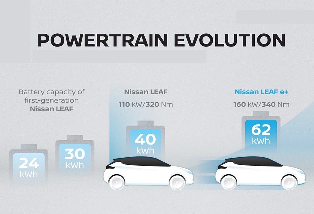 The new Leaf Plus improves range and acceleration thanks to additional cells and a higher-output motor.