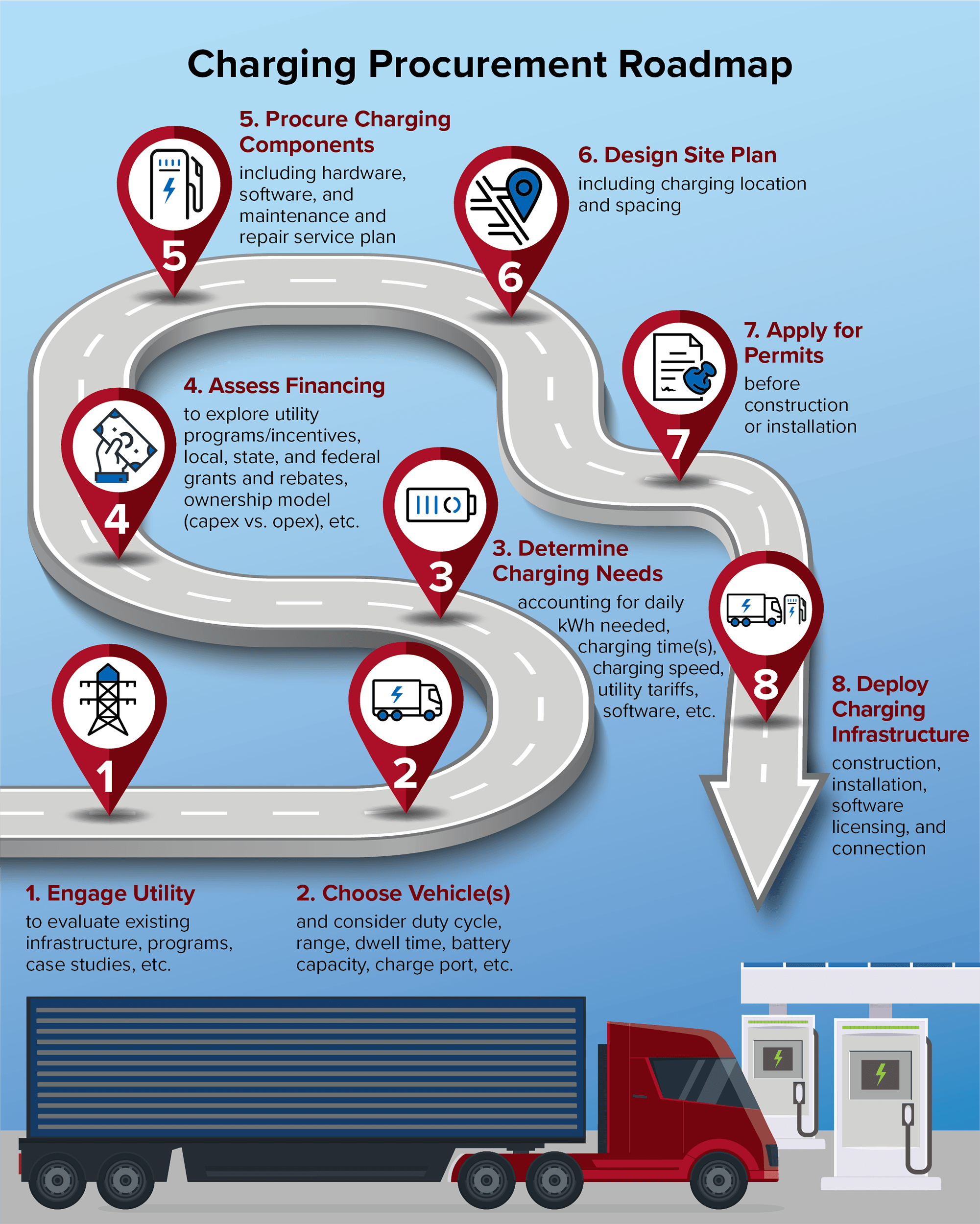 “Return-to-base” or depot charging will be the focus at first, because it removes some of the uncertainties involved—including which type of EVSE (electric vehicle supply equipment) will likely be utilized.