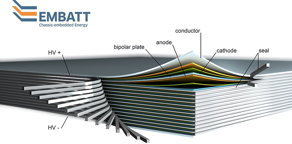 An in-development chassis-integrated sandwich structure of solid electrolytes is projected to deliver all-electric driving ranges that far out-distance today’s typical 200-mile (320 km) EV real-world driving range. IAV, Thyssenkrupp AG and Fraunhofer Institute for Ceramic Technologies and Systems (IKTS) are the core project partners working to develop EMBATT, a chassis-embedded energy technology.