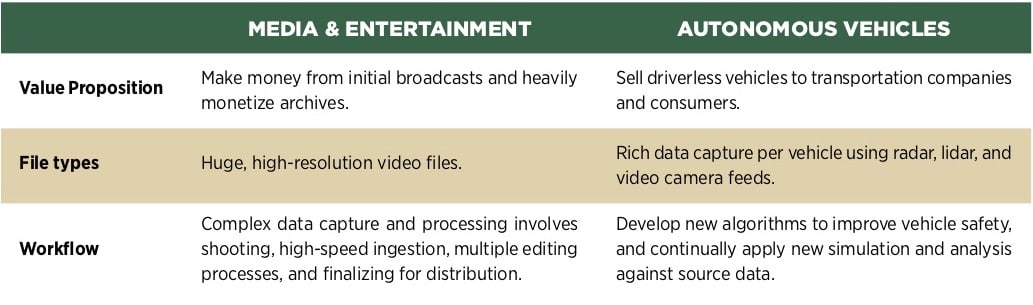 But AVs and M&E do have a lot in common when it comes to their data. Both generate hundreds of petabytes of data per year. Both need to manage that data for retrieval and value, and both need to store that data with security and data protection.