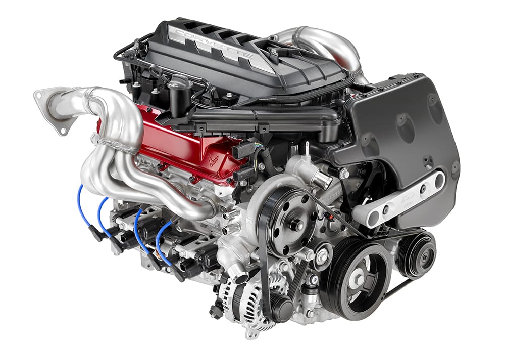 GM’s new LT2 fifth-generation small-block V8 may have roots extending back to 1955, but it brings a long list of new features to the party. Its aluminum block has revised oiling and venting arrangements in support of a dry-sump lubrication system with one pressure and three scavenge pumps. The sump casting is shallower to allow mounting the engine 1 in. (25 mm) lower in the car versus C7. The crankshaft nose is longer, to power revised accessory drives. There’s an oil reservoir mounted at the top-left corner of the engine and the oil cooler’s capacity is 25% greater than in C7 for more dependable operation during extreme (track or desert driving) conditions.