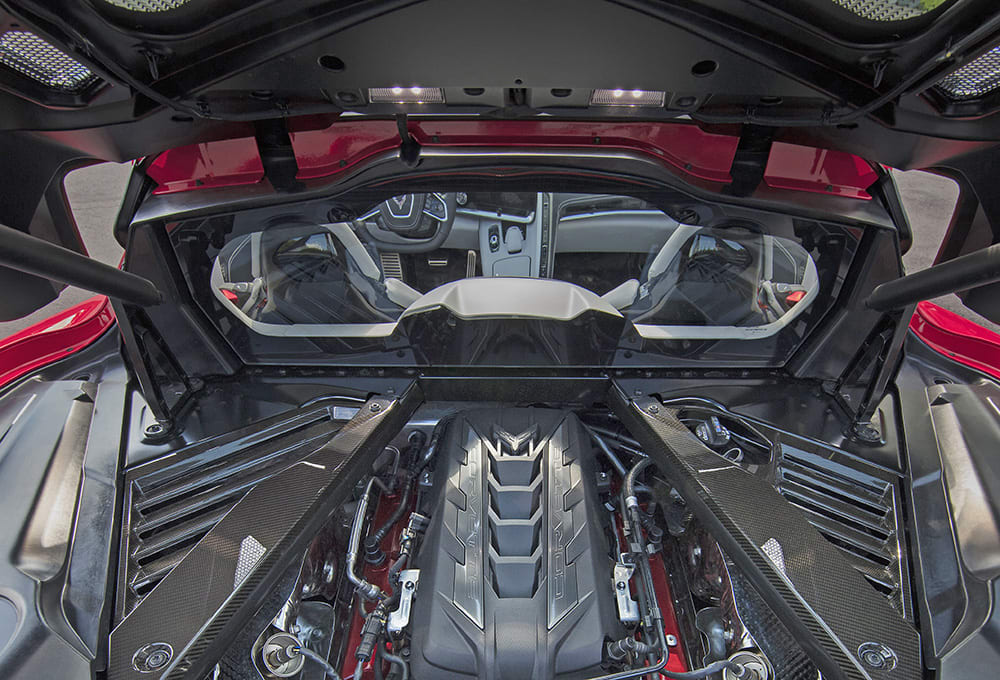 C8’s small-diameter, two-spoke steering wheel is flattened top and bottom to avoid obscuring the view of the 12-in. (305-mm) reconfigurable instrument cluster. There are three seat choices to balance comfort and support under aggressive (racetrack) driving conditions, six interior colors, two optional upholstery stitch choices and six seatbelt colors. Add to that two wheel designs and an unprecedented 12 exterior colors. The options list includes a wireless phone charger, 14-speaker Bose audio system and a high-definition performance data recorder. One thoughtful feature is a traditional round volume knob on the center console’s touchscreen.
