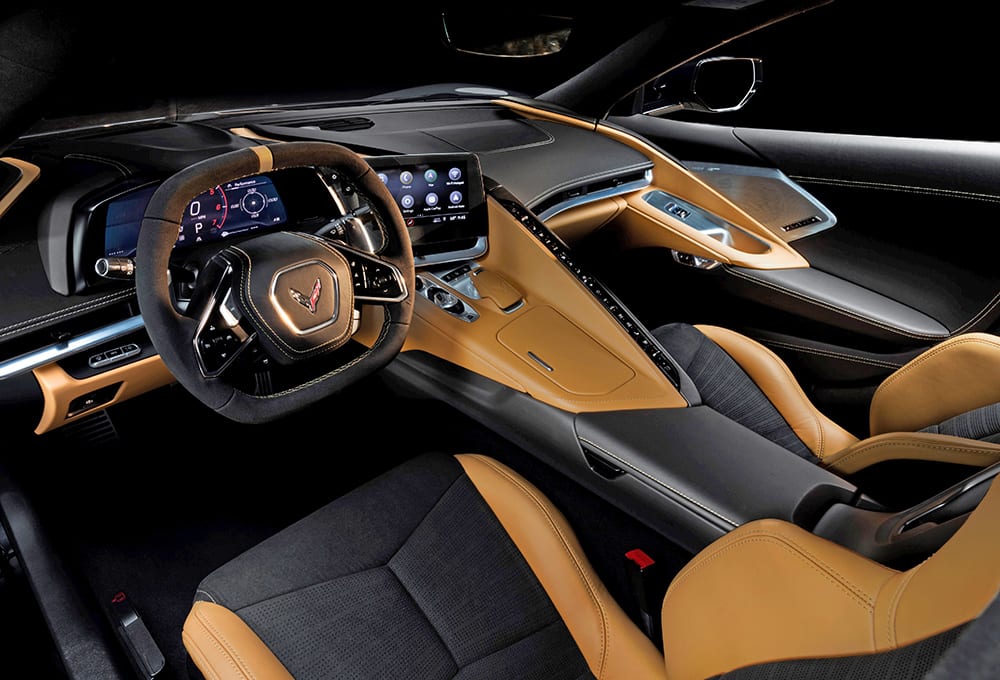 Thanks to its robust 12-in. (305-mm)-tall center tunnel, the new spaceframe is relatively light and claimed to be 10% stiffer than before to provide a solid foundation for steering, suspension and powertrain components. With no need for tall, wide rocker sections to supply the desired structural integrity, the C8’s ingress and egress are exemplary.