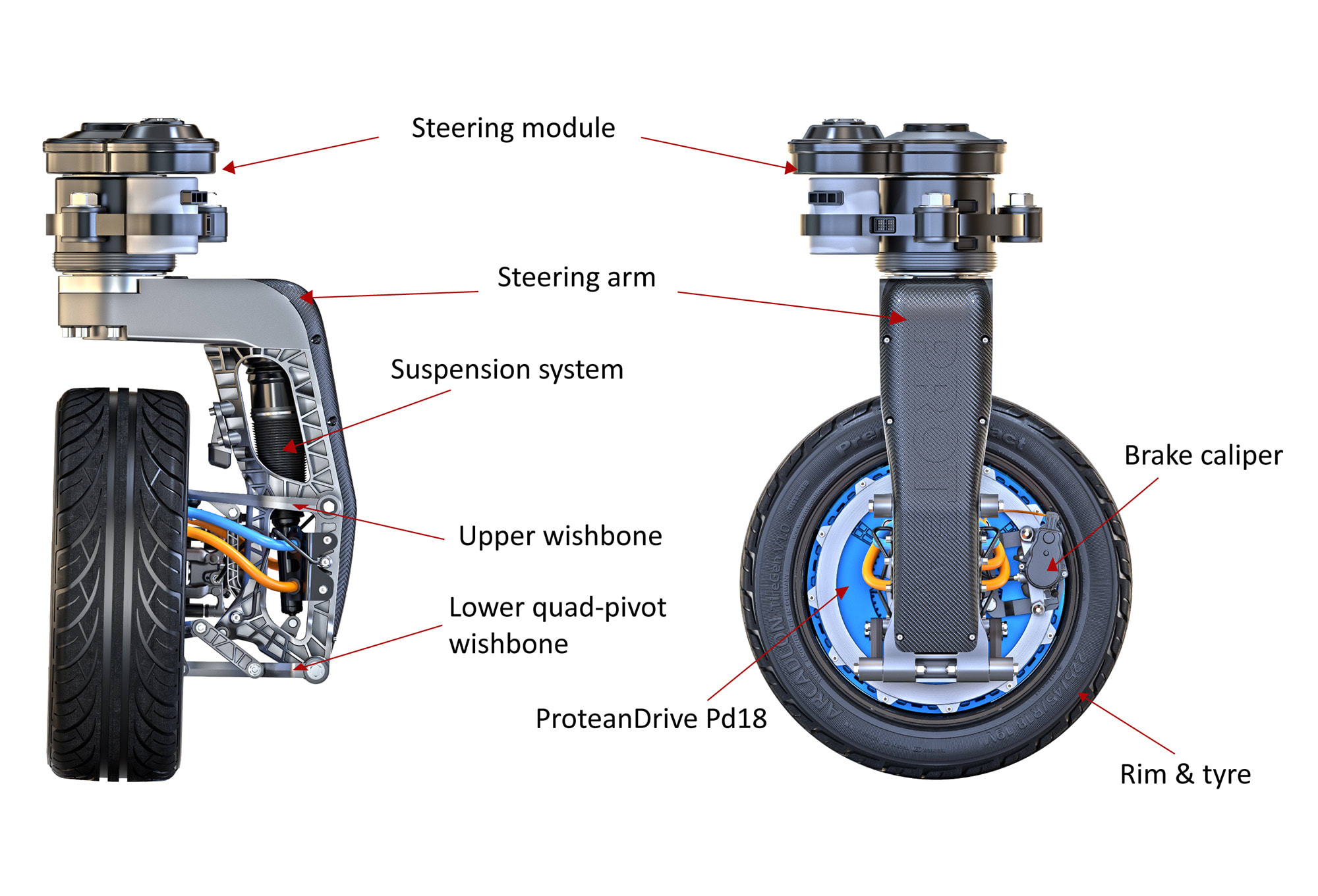 Packaging proved the most challenging development. “Novel solutions were required, for which we have patent applications,” Hilton said. “Firstly, for the steer-by-wire unit that supports unlimited rotation without stressing the cables and pipes that supply the Protean 360+ module; and secondly, to a multi-link suspension system with an additional lower wishbone pivot. This quad-pivot system keeps the suspension system within the required packaging envelope while allowing the desired suspension kinematic.”