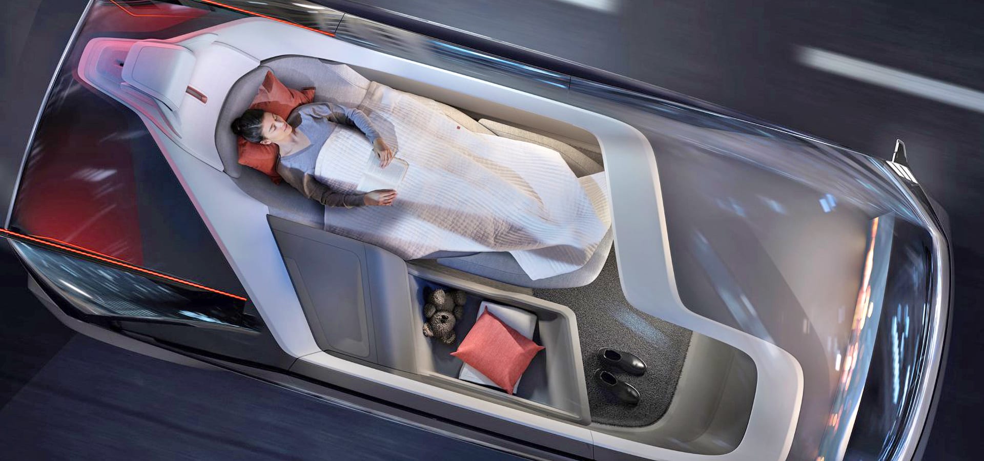 LJ: It’s a very early idea based on the Volvo 360C, a concept car (top) that in the future you might take during the night instead of an airplane. You can have a good meal sitting upright working, and then you lay flat and sleep. To make this possible to launch, we need to make sure that we can protect passengers when lying completely flat. So you could get a nice blanket for comfort, but it would be activated in a crash.