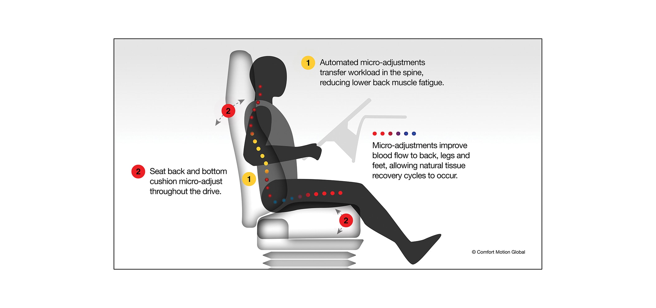 Comfort Motion Global (CMG) engineers have developed and refined a “proactive” Motion Seating software technology throughout the past 15 years that improves blood flow and reduces occupant fatigue through automated, micro-adjustments (1° or less) of the driver and passenger seats. Studies conducted with researchers at Ball State University for passenger vehicles showed an increase in driver alertness. Reaction times improved by 200 milliseconds between the static seat and the motion seat, which translates to about 17 to 20 feet of stopping distance, according to Dr. Paul Phipps (below), an Indianapolis-based chiropractor who developed the customizable algorithm.