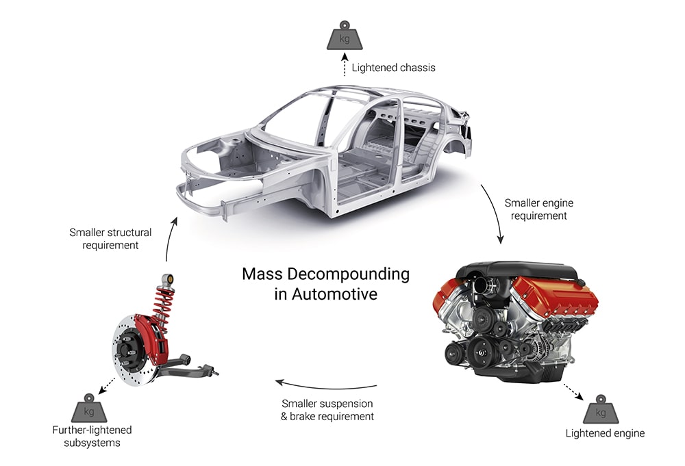 Automakers have been focused on lightweighting their vehicles for years, motivated by fuel economy, performance and safety. This engineering task is becoming increasingly difficult as the areas to trim become fewer, and the requirements become more stringent (namely fuel/battery economy). It is estimated that (on average) every pound of savings on structural, load-bearing parts provides an opportunity to save nearly a pound on subsystems (steering, brakes, suspension, etc.), a trend known as mass-decompounding.